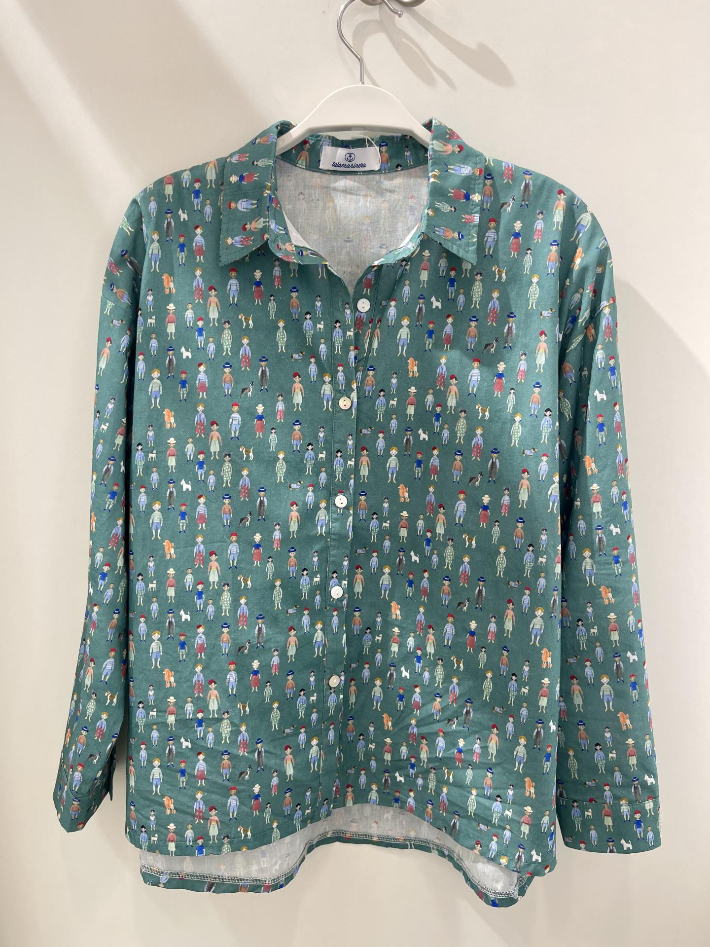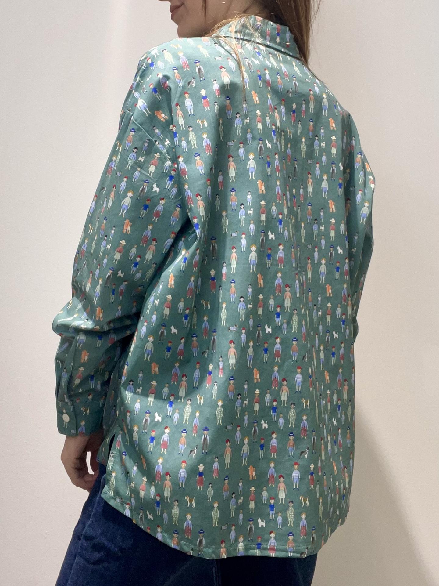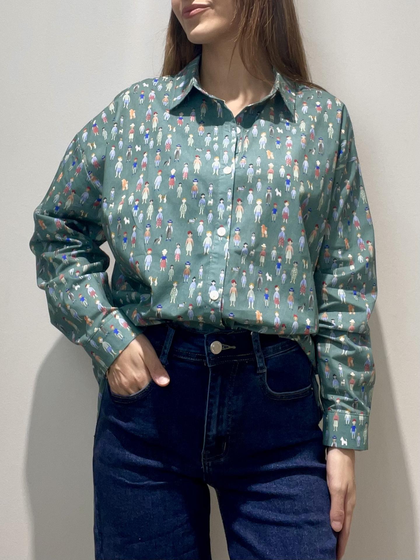 Camisa de manga larga con estampado de figuras humanas y perros. Cuello solapa con cierre frontal con botones. Corte relajado y oversize.