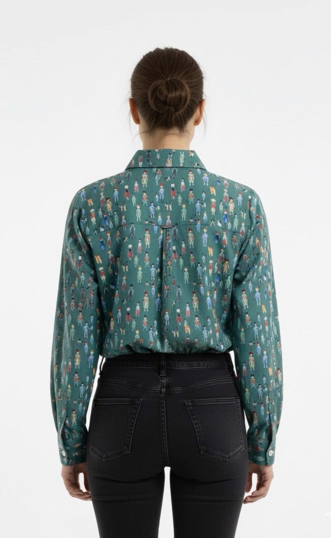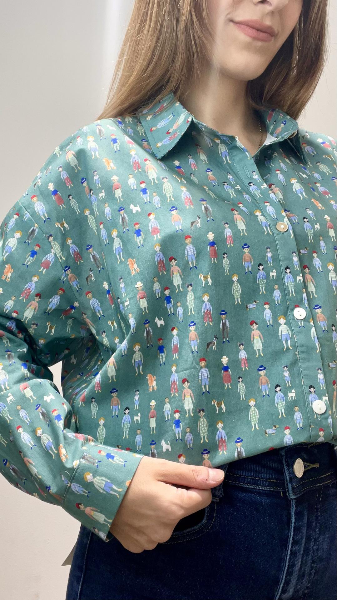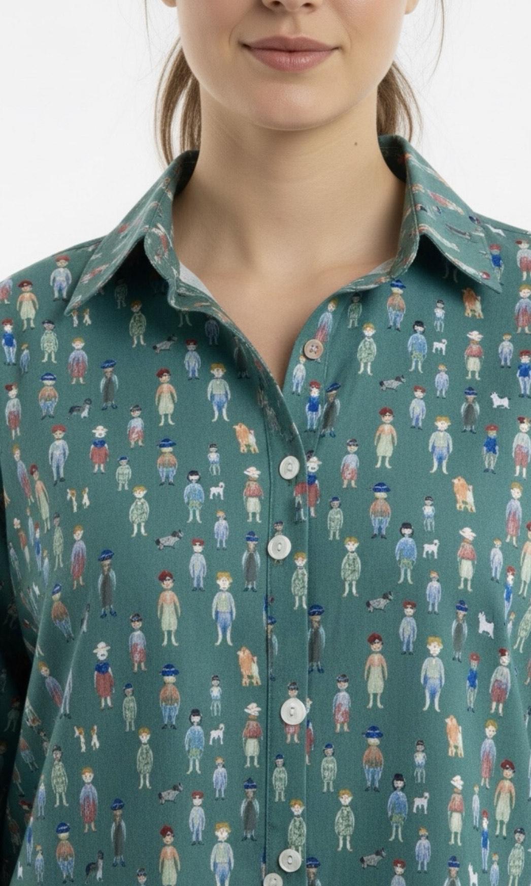 Camisa de manga larga con estampado de figuras humanas y perros. Cuello solapa con cierre frontal con botones. Corte relajado y oversize.