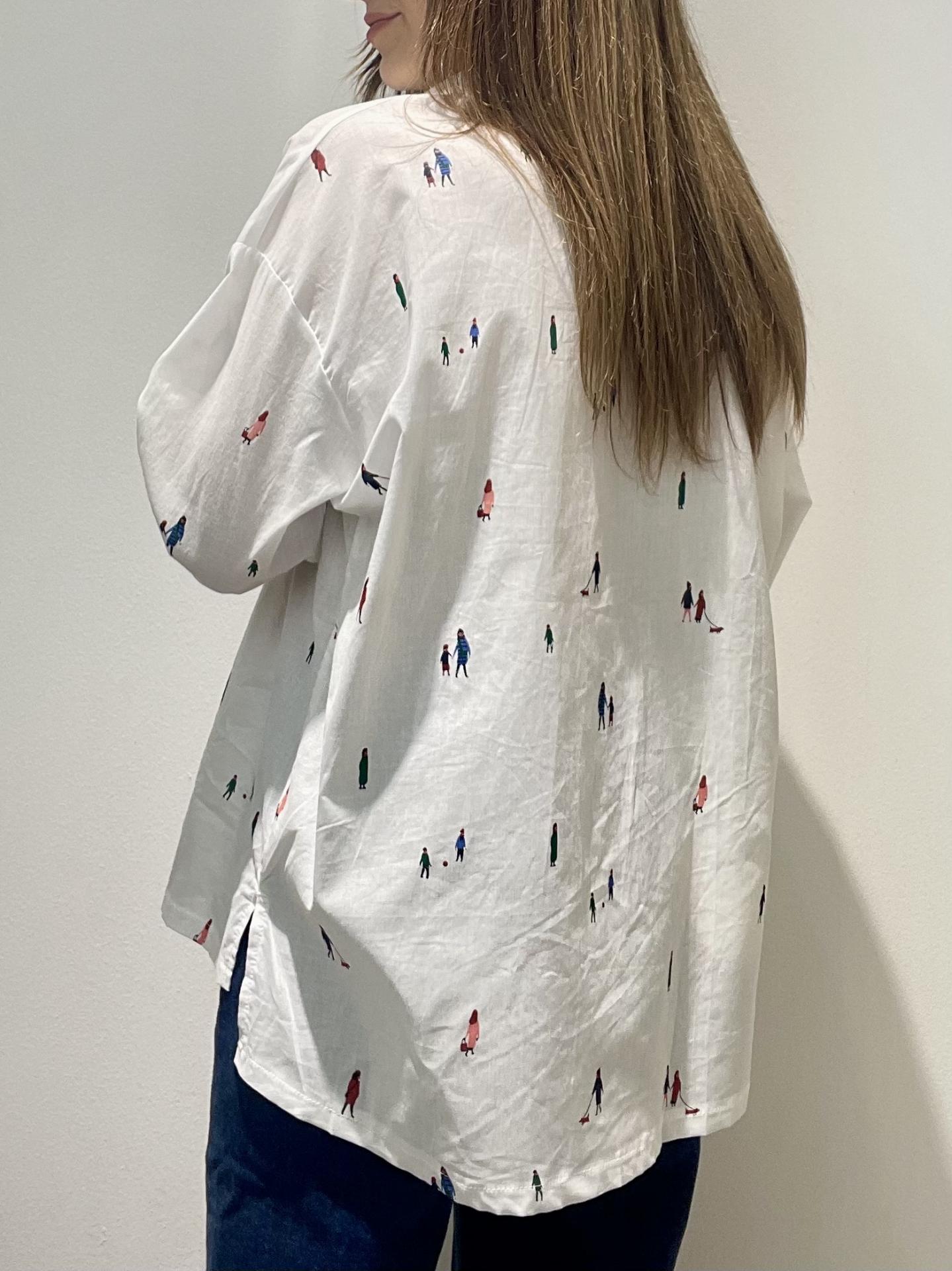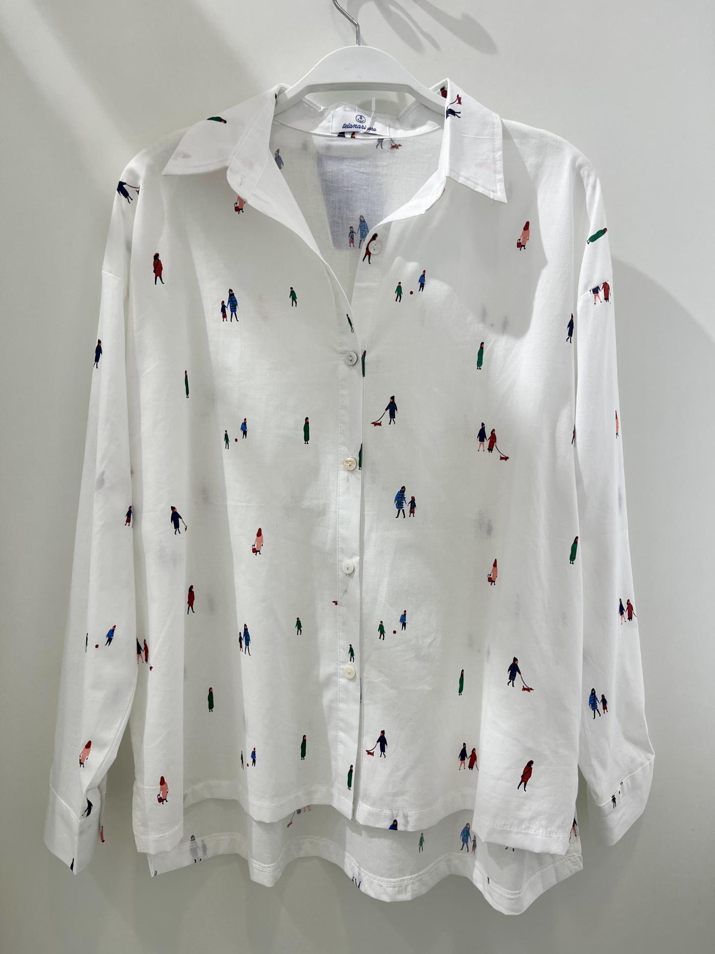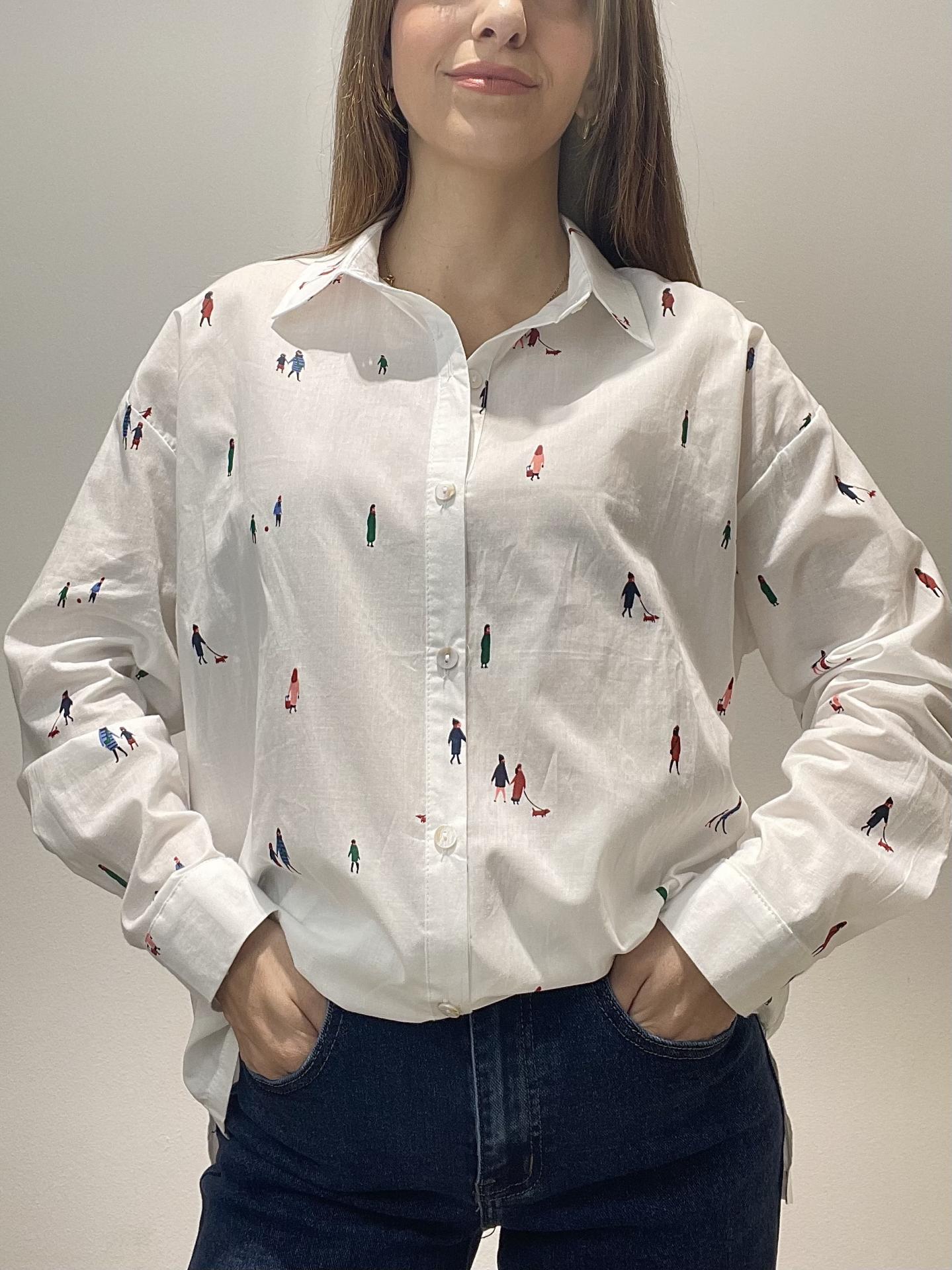 Camisa de manga larga con estampado de figuras humanas y perros paseando. Cuello solapa con cierre frontal con botones. Corte relajado y oversize.
