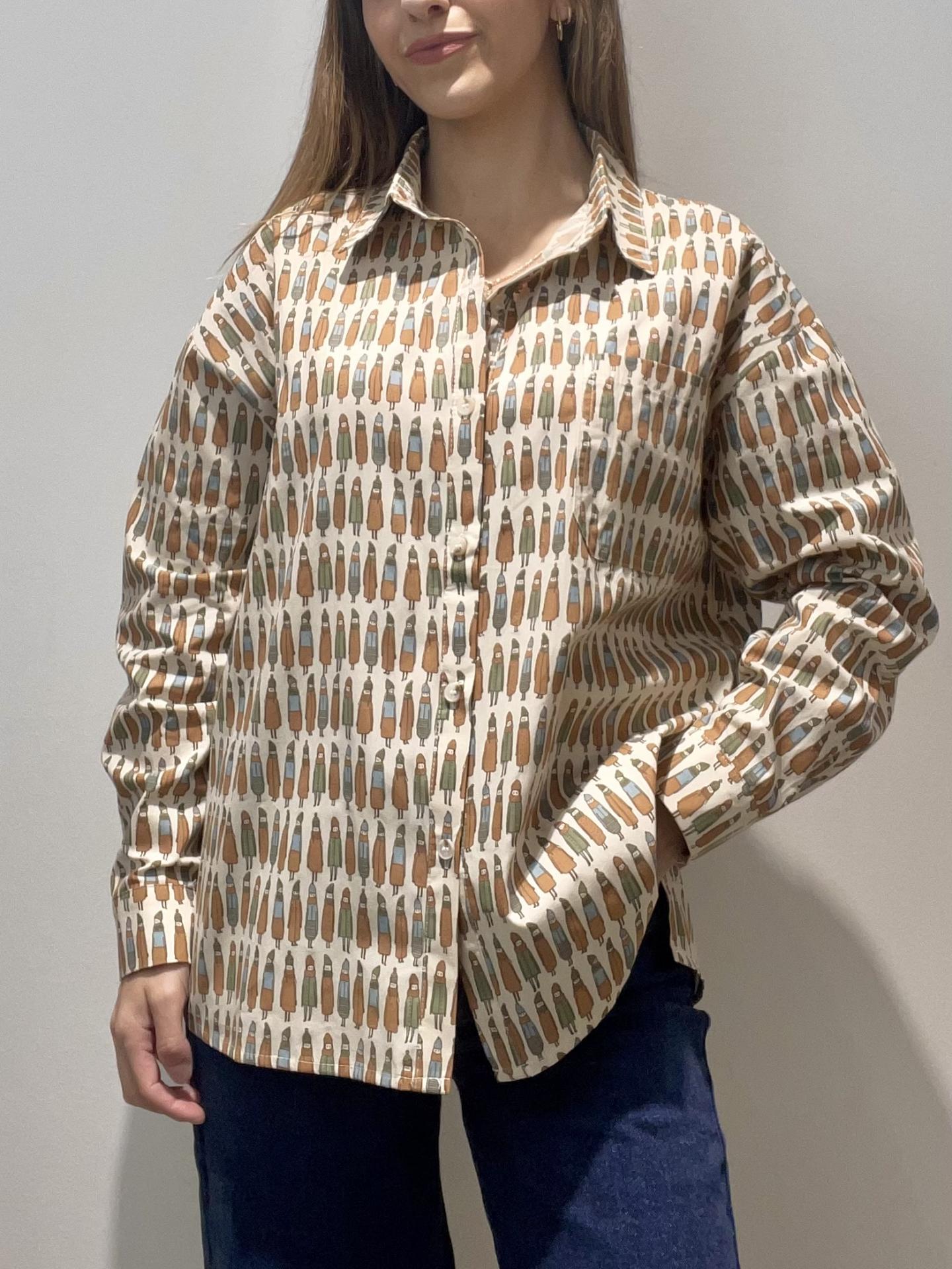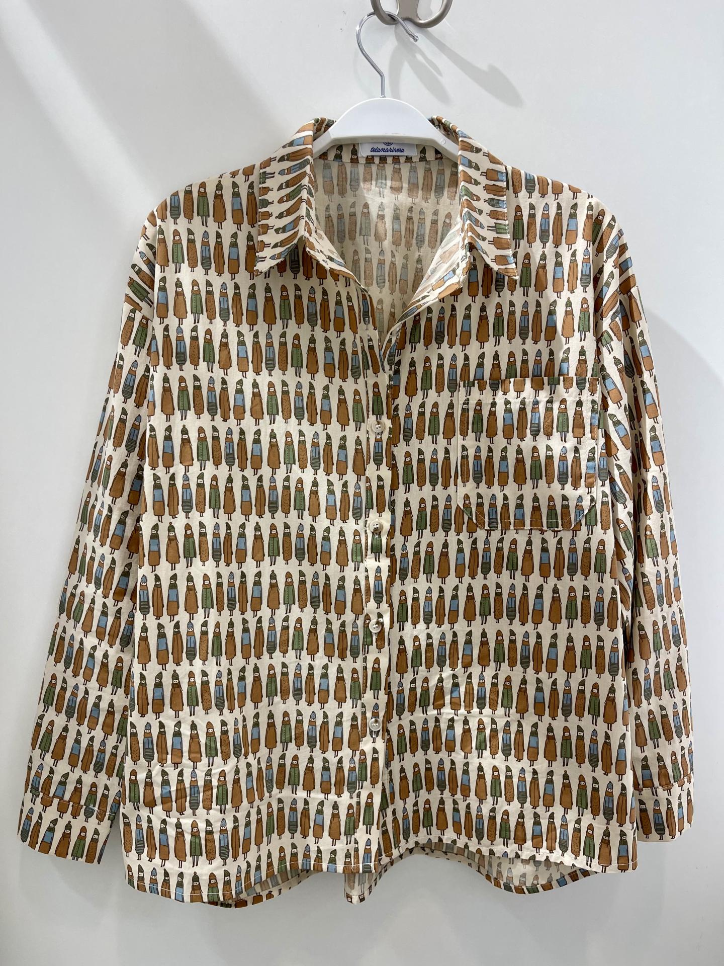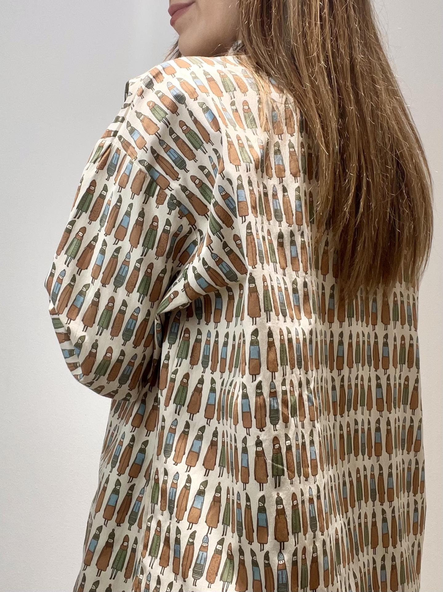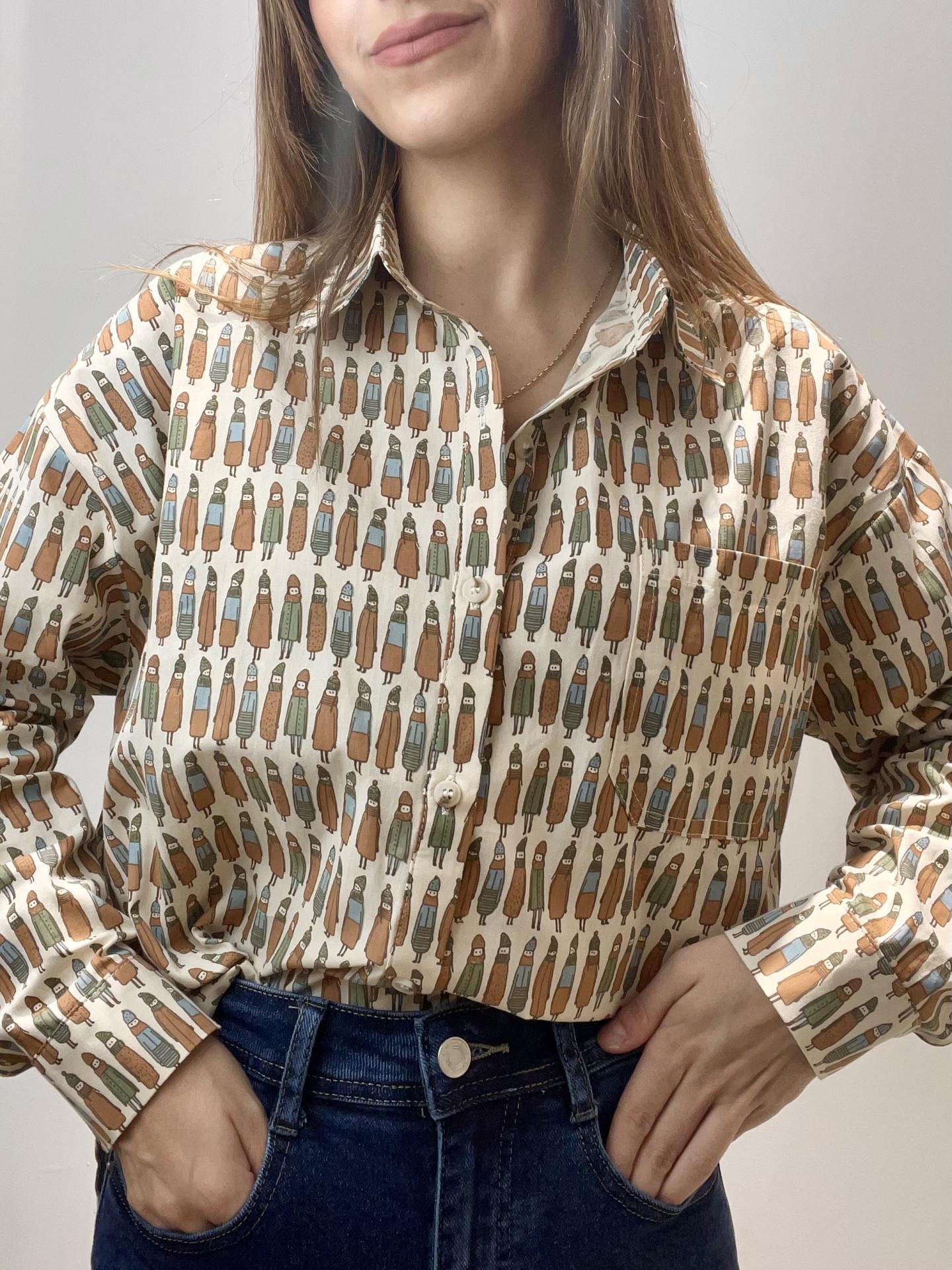Camisa de manga larga con estampado de figuras humanas con ropa de invierno. Cuello solapa con cierre frontal con botones. Bolsillo en el pecho. Corte relajado y oversize.