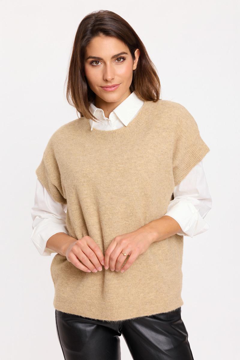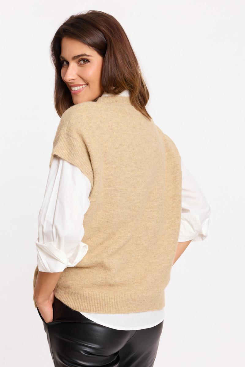 Chaleco de punto oversize sin mangas con cuello redondo. Tejido de punto suave y cálido. Diseño holgado con hombros caídos. Remate de punto de canalé en cuello, mangas y bajo.