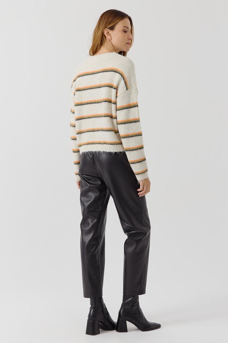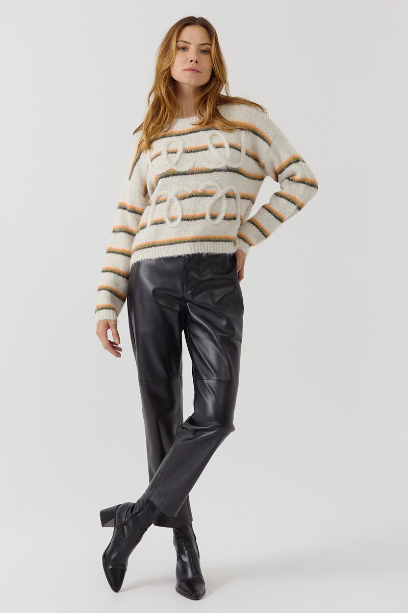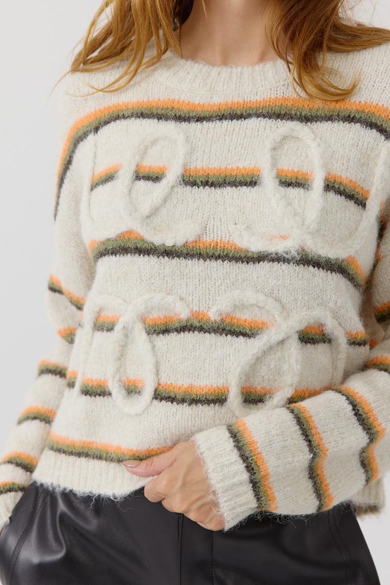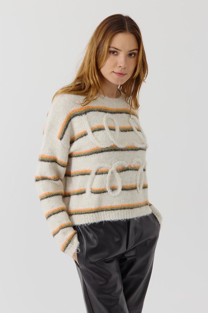 Suéter de manga larga y cuello redondo. Tejido de punto suave con efecto pelo. Diseño Oversize con estampado a rayas horizontales en tonos naranja, verde y marrón. Detalle en relieve frontal con la palabra ''Love'.