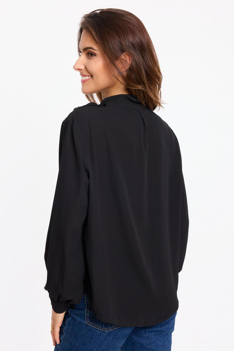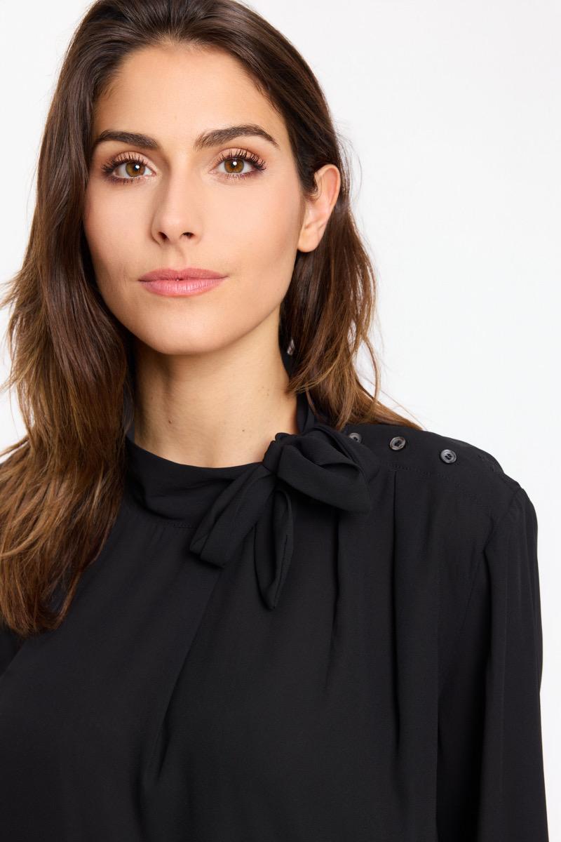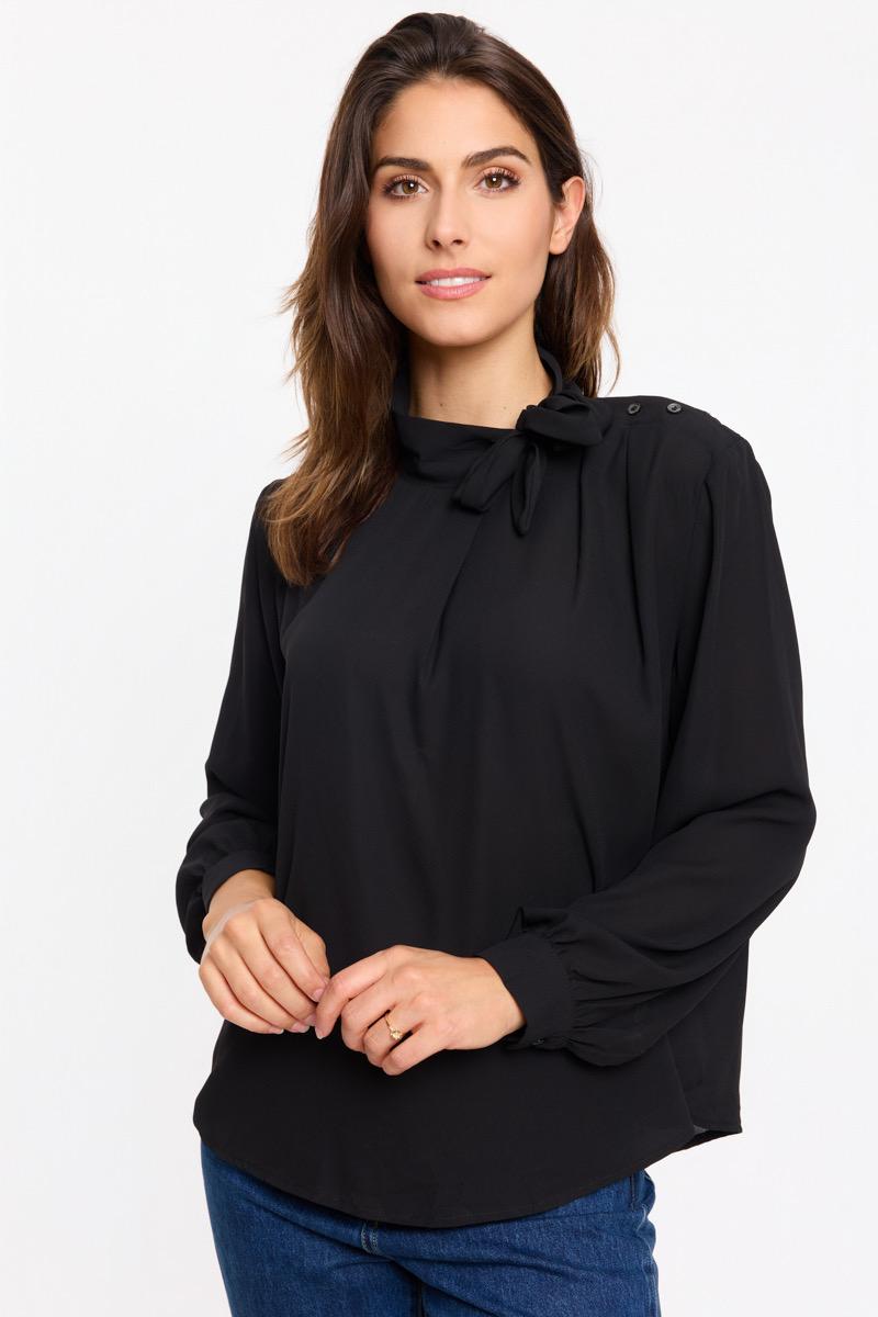 Blusa de manga larga con cuello alto con lazada incorporada. Tejido ligero y fluido. Cierre de botones a la altura de un hombro.