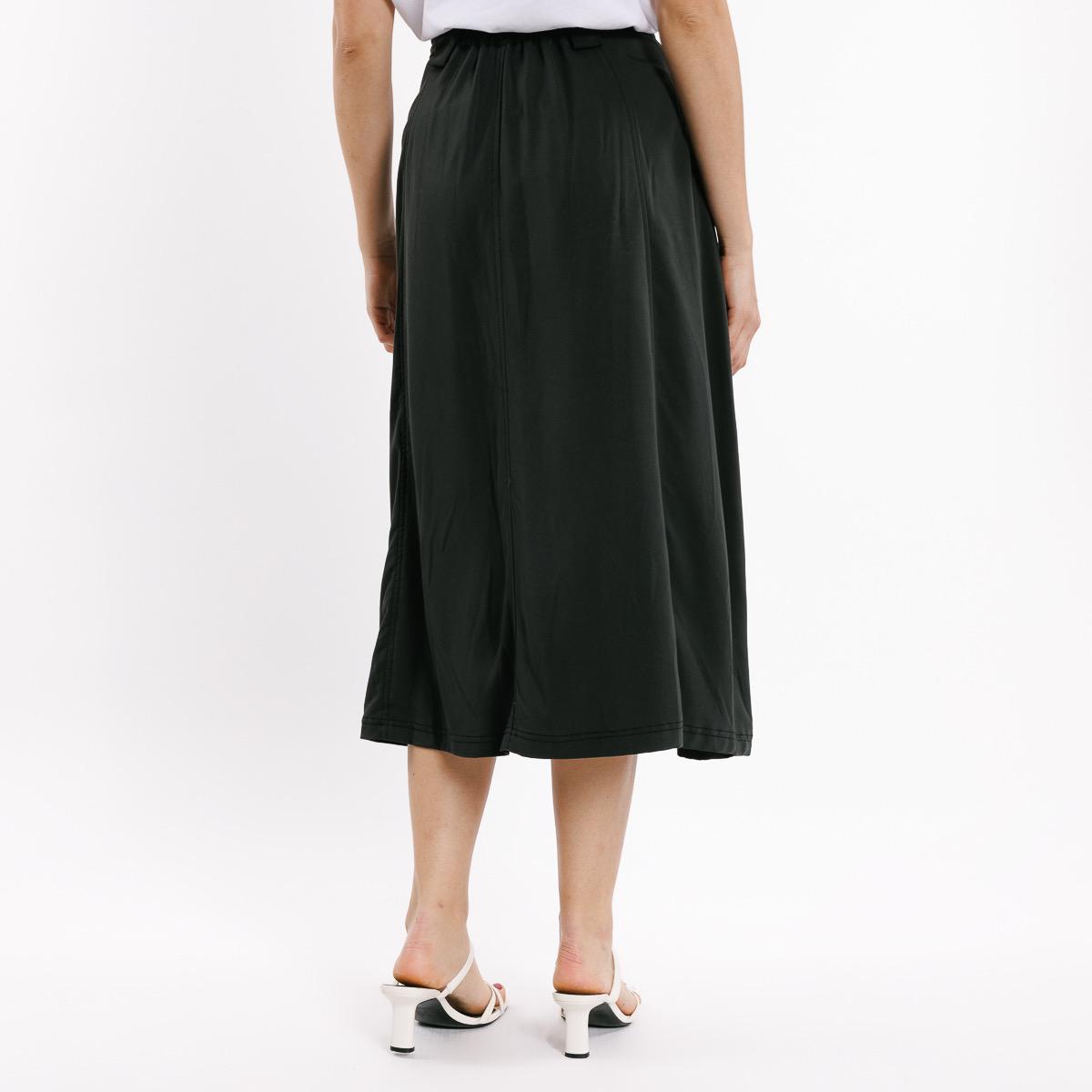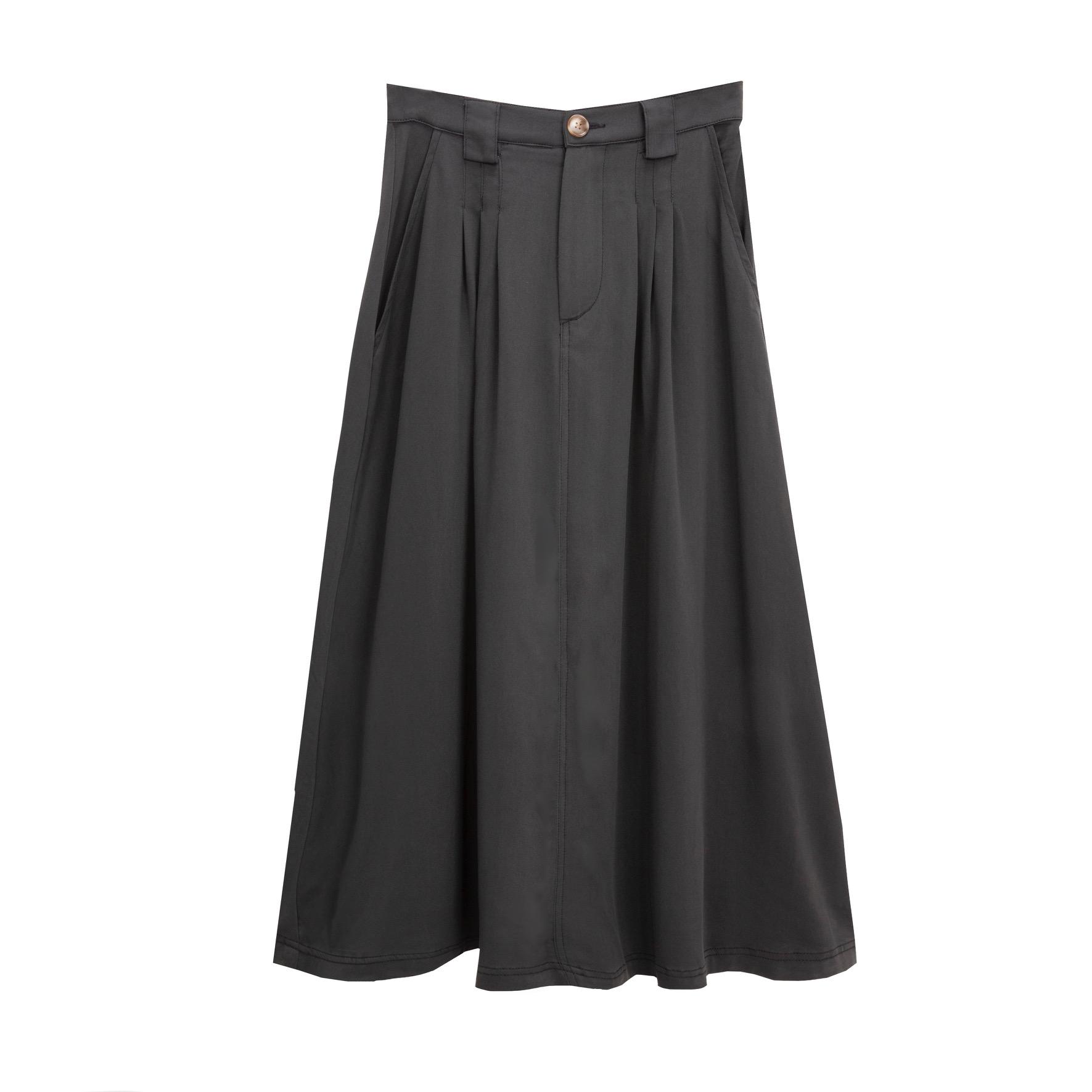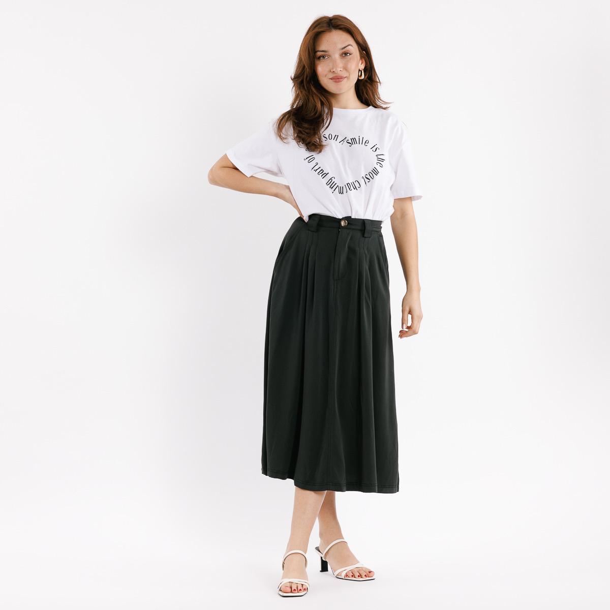 Falda midi con cintura alta con trabillas. Cierre de botón con cremallera y bolsillos en los laterales. Detalle de pinzas en la parte delantera. Tejido ligero con caída fluida. Goma elástica en la parte de atrás.
