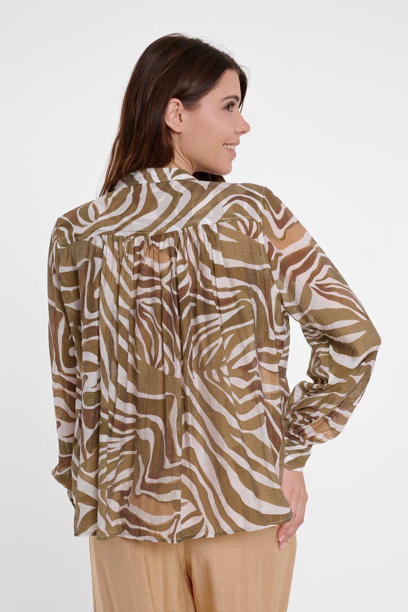 Blusa de manga larga y cuello mao. Diseño oversize. Estampado de cebra con tonos verdes, marrones y blancos. Cierre delantero con botones anacarados. Frunces en la parte delantera y en el canesú de la espalda.