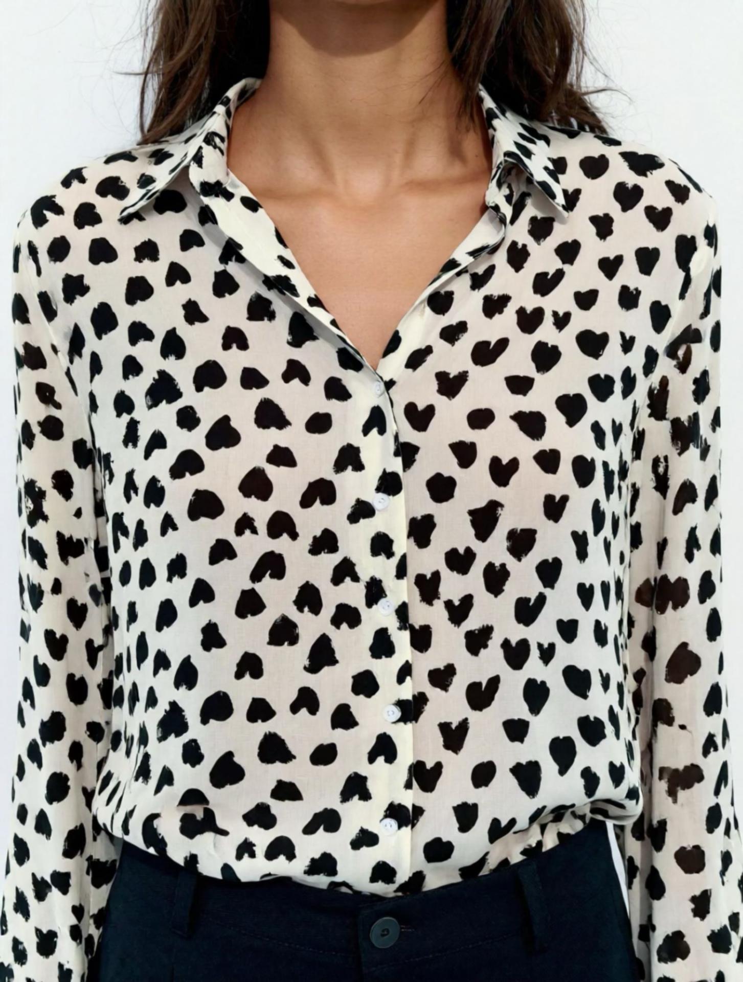Camisa de manga larga con cuello camisero con escote en V. Estampado de corazones irregulares con efecto pincelado. Tejido suave y ligero. Cierre de botones en la parte frontal.