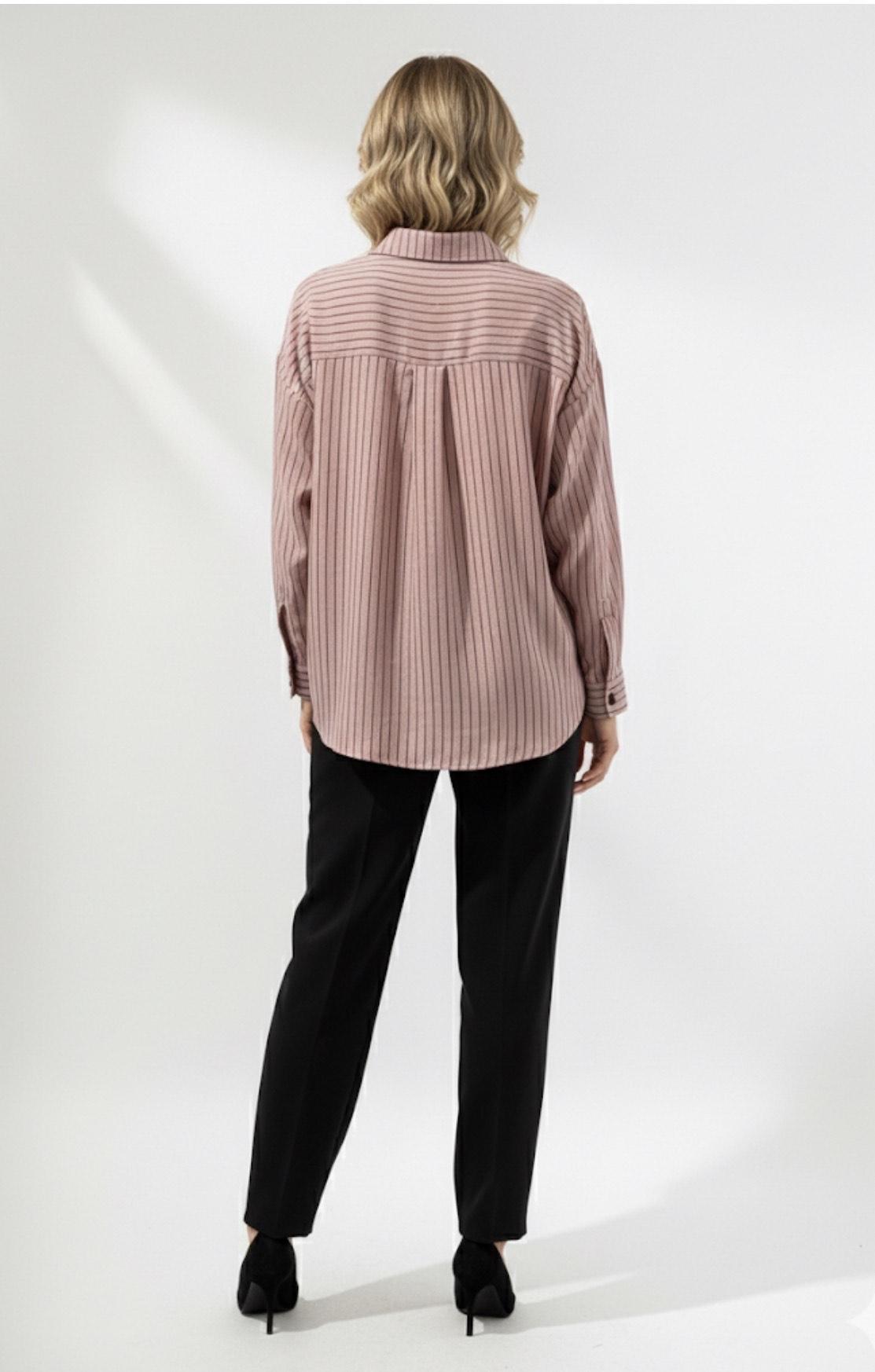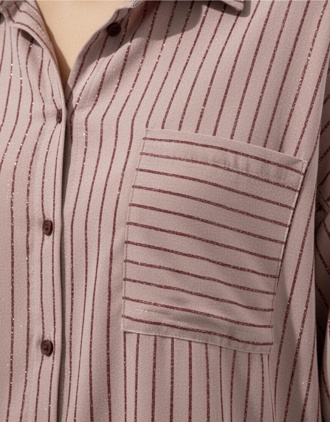 Camisa de manga larga con cuello solapa. Tejido suave y ligero. Estampado de rayas finas con un toque de brillo. Corte holgado y oversize. Cierre de botones delanteros con bolsillos en la zona frontal.