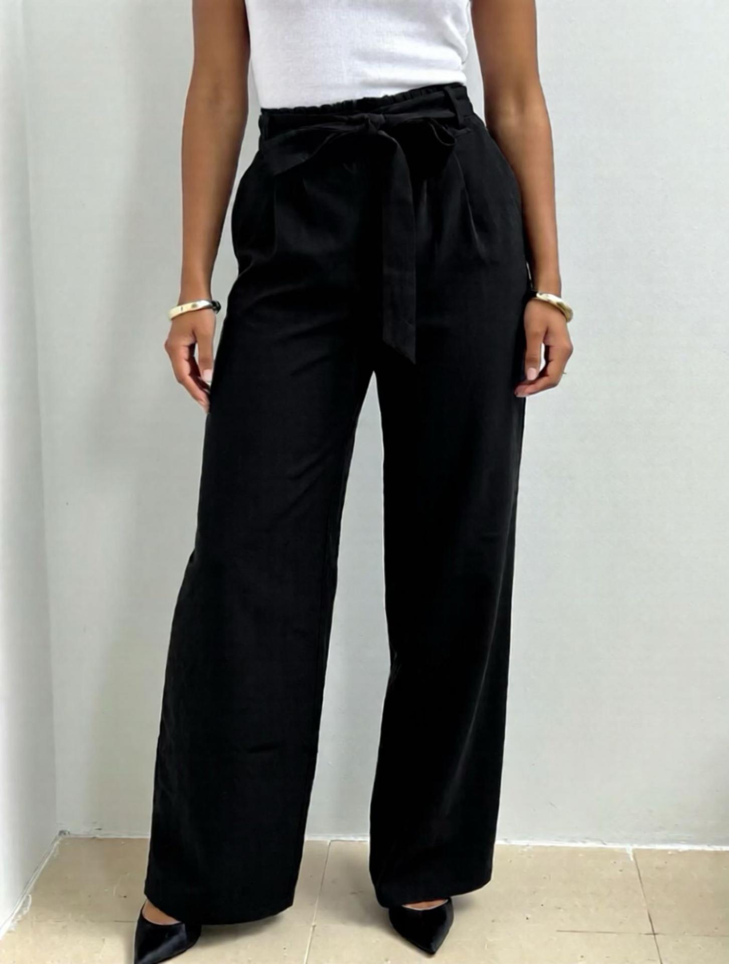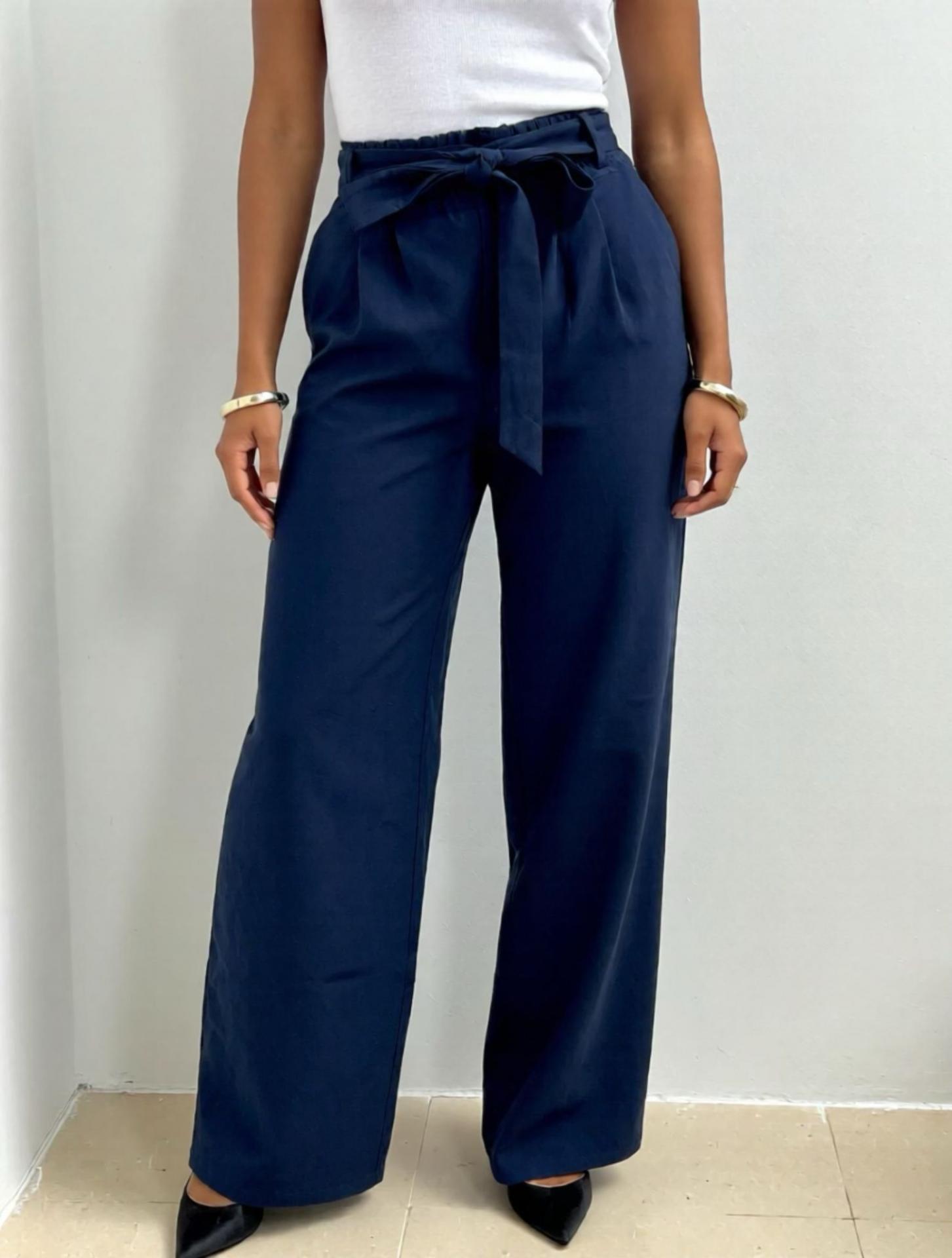Pantalón largo con corte de pernera recta y ancha. Cintura alta con pinzas y detalle elástico trasero. Cintura con trabillas y cinturón. Tejido fluido y ligero.