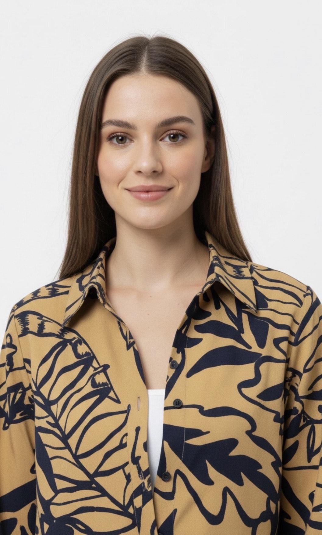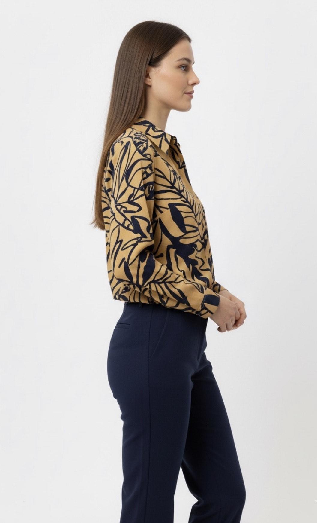 Camisa de manga larga y cuello solapa con escote en V. Estampado vibrante con hojas en contraste en mostaza y azul marino. Tejido ligero y con caída.