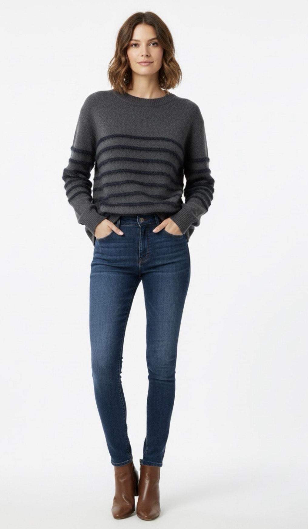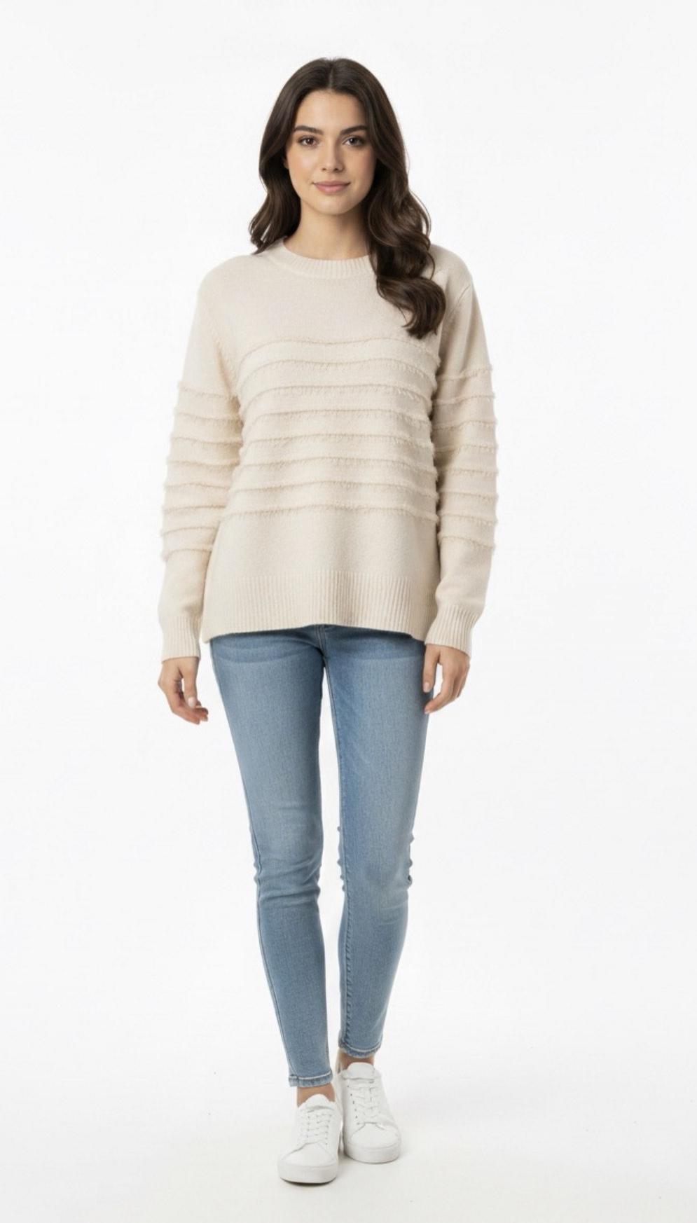 Suéter de manga larga y cuello redondo. Tejido de punto agradable con estampado de rayas horizontales en relieve. Efecto de pelo en la zona de las rayas. La parte trasera es lisa (sin rayas).