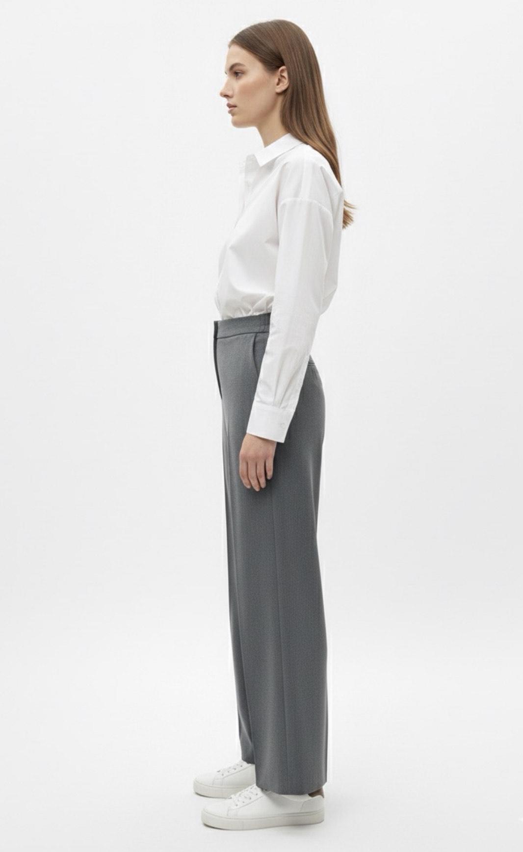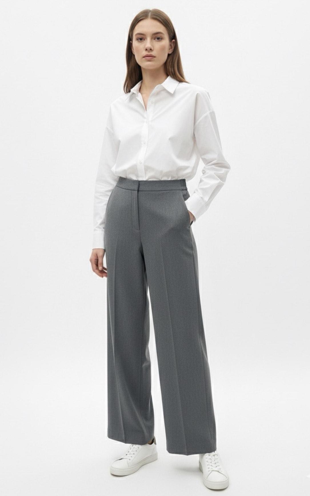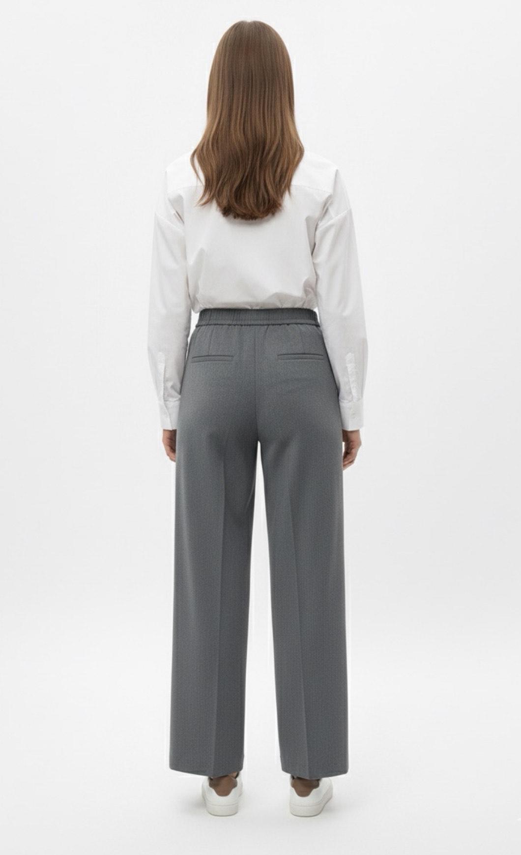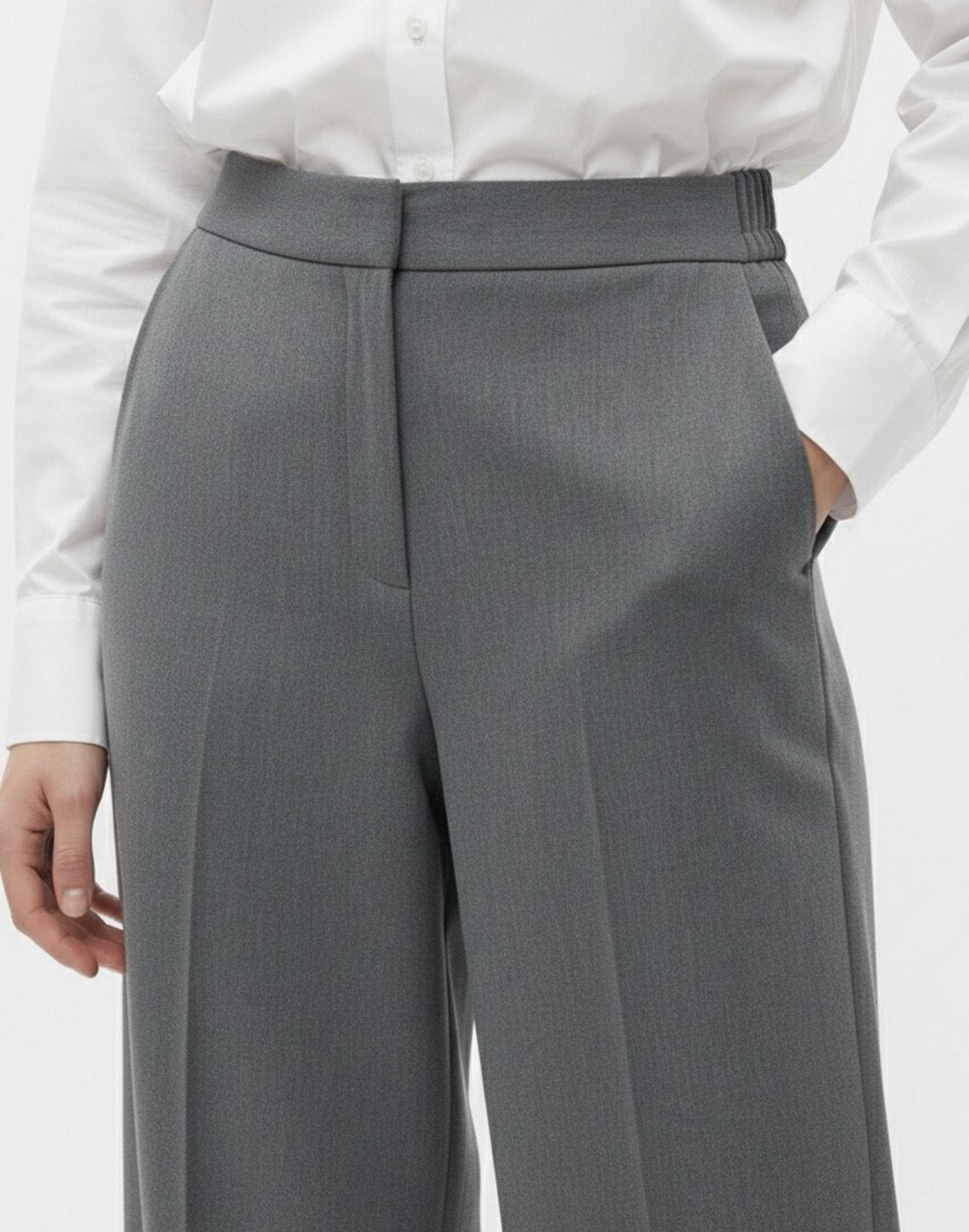 Pantalón largo de sastre de pierna ancha y recta. Cintura elástica trasera y plana en la parte delantera. Cierre frontal con cremallera y gancho interior. Bolsillos delanteros en los laterales.