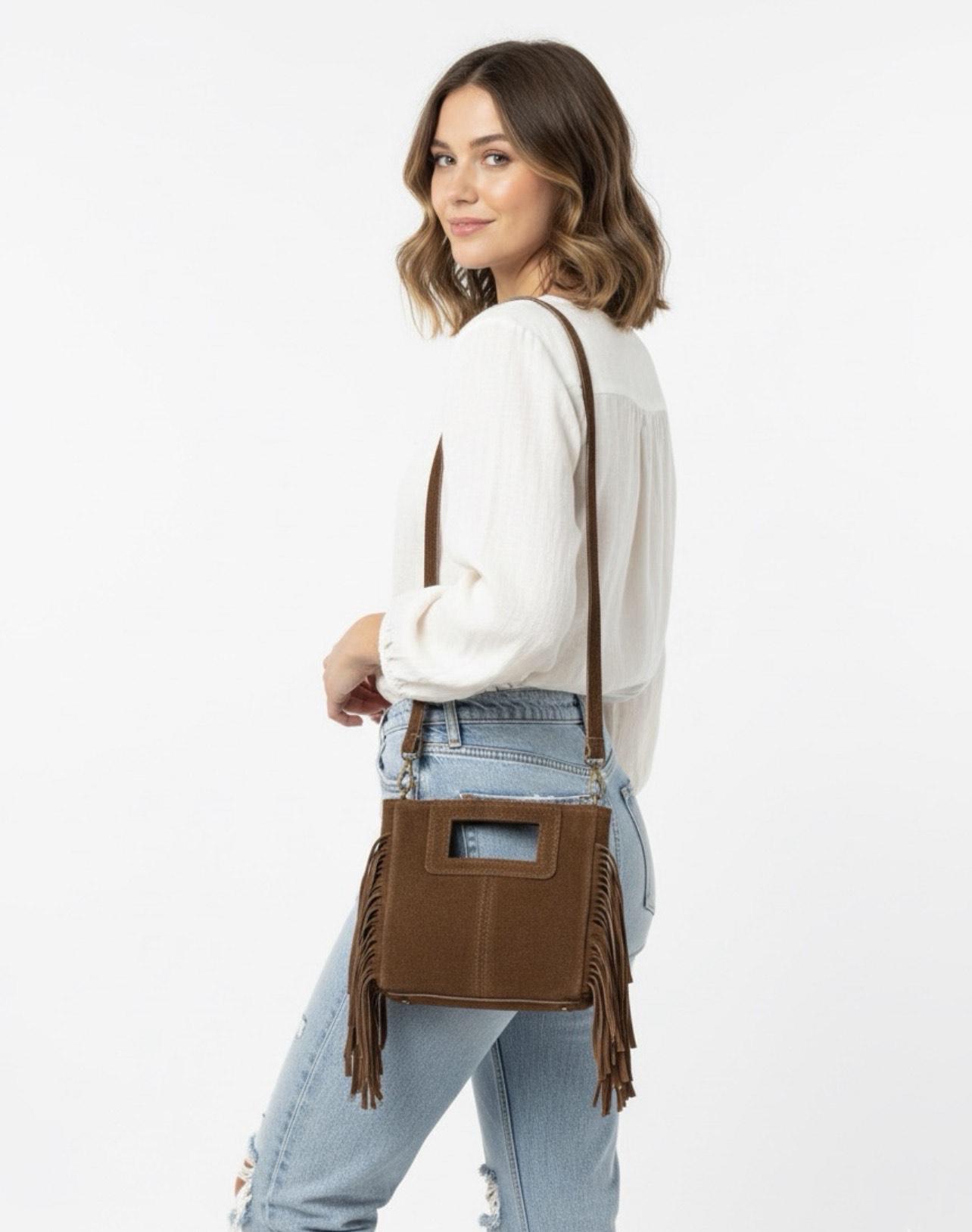Bolso de piel con textura de ante con flecos. Diseño cuadrado con asas para llevarlo cómodamente en la mano. Incluye también un asa regulable para llevarlo colgado al hombro o cruzado. Cierre de cremallera.