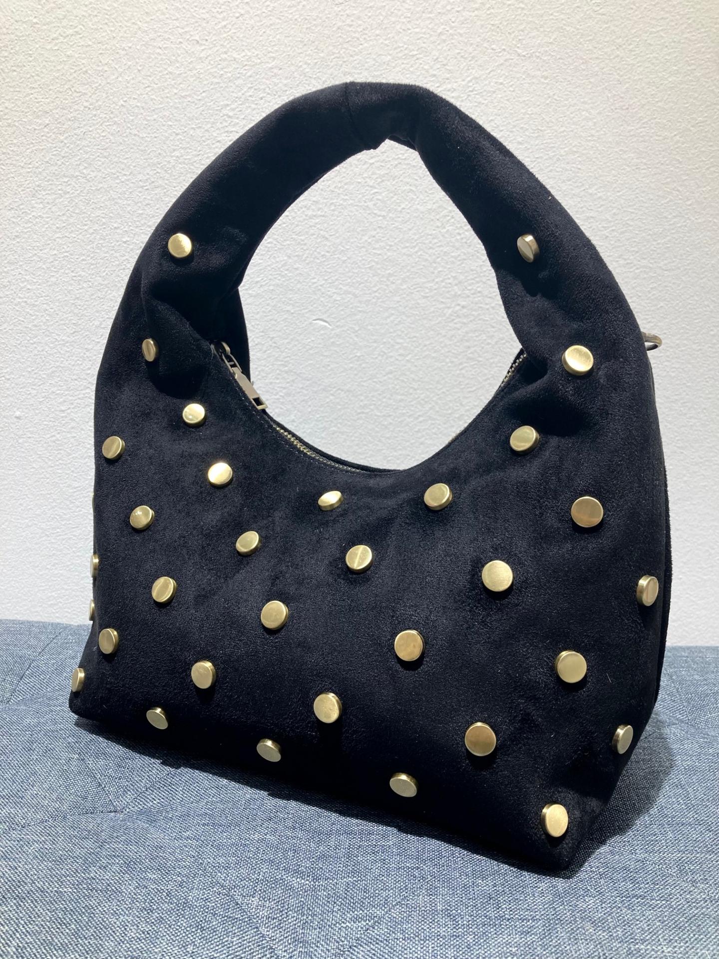 Bolso mediano negro de antelina con cierre de cremallera. Tachuelas doradas. Incluye cinta bandolera. Interior forrado con dos bolsillos.