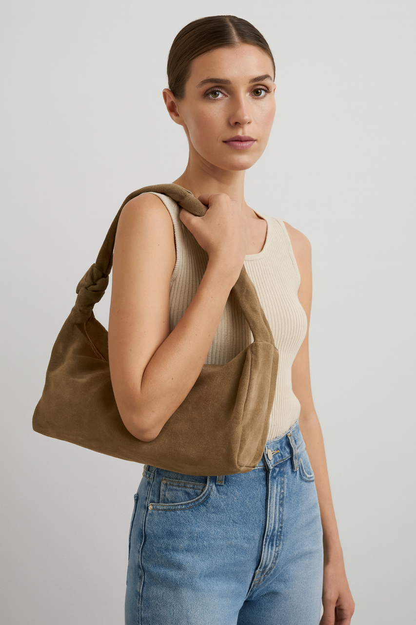 Bolso de piel rectangular con nudo en el asa. Cierre de cremallera. Incluye correa bandolera de piel. Interior forrado con bolsillo.