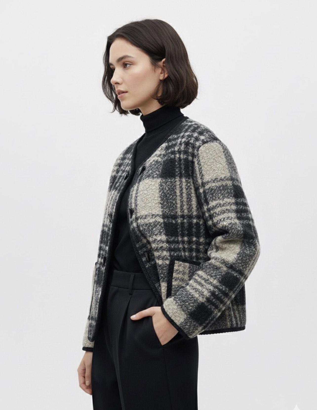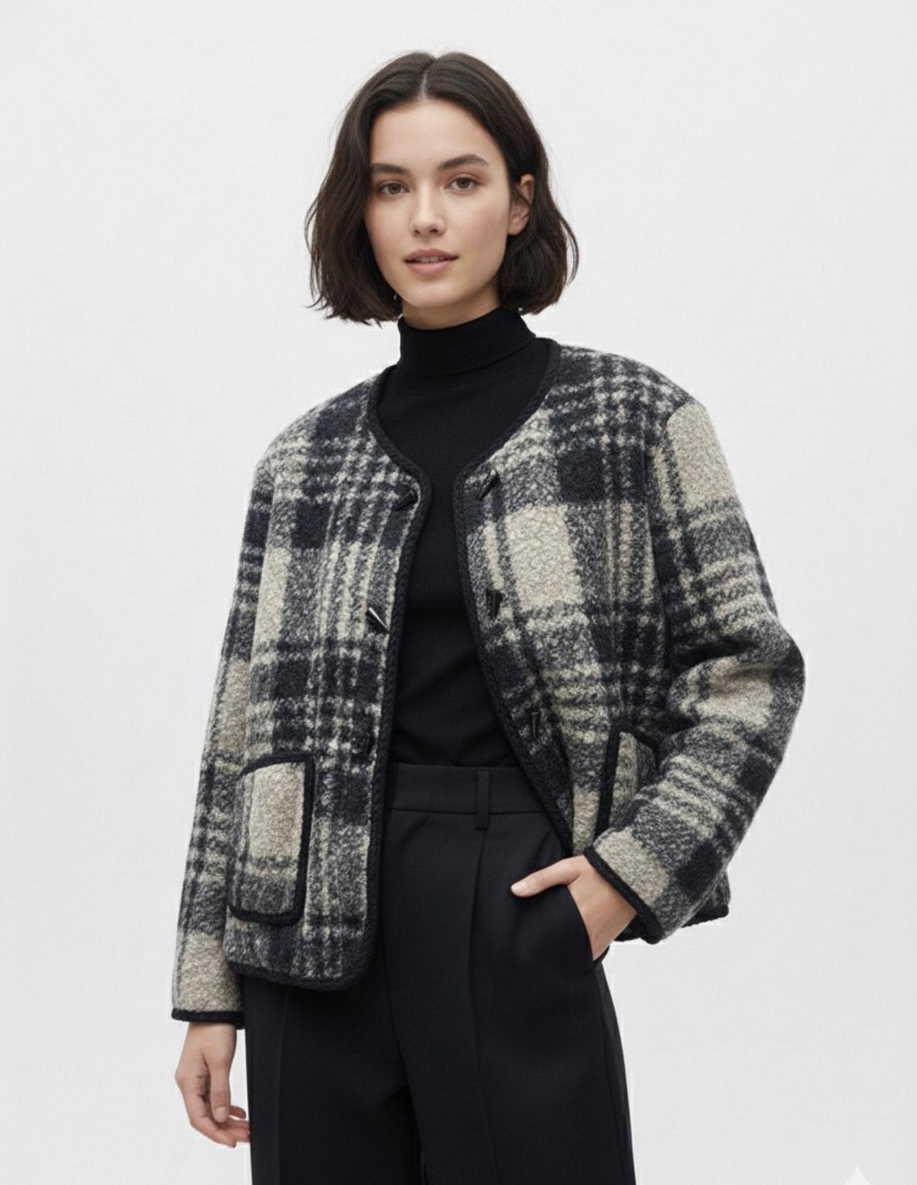 Chaqueta corta de manga larga. Textura de pelo efecto bouclé. Estampado a cuadros en tonos beige y negro. Ribete trenzado bordeando los bordes. Cierre delantero con botones. Bolsillos de parche en la parte delantera. Forro interior acolchado ligero.