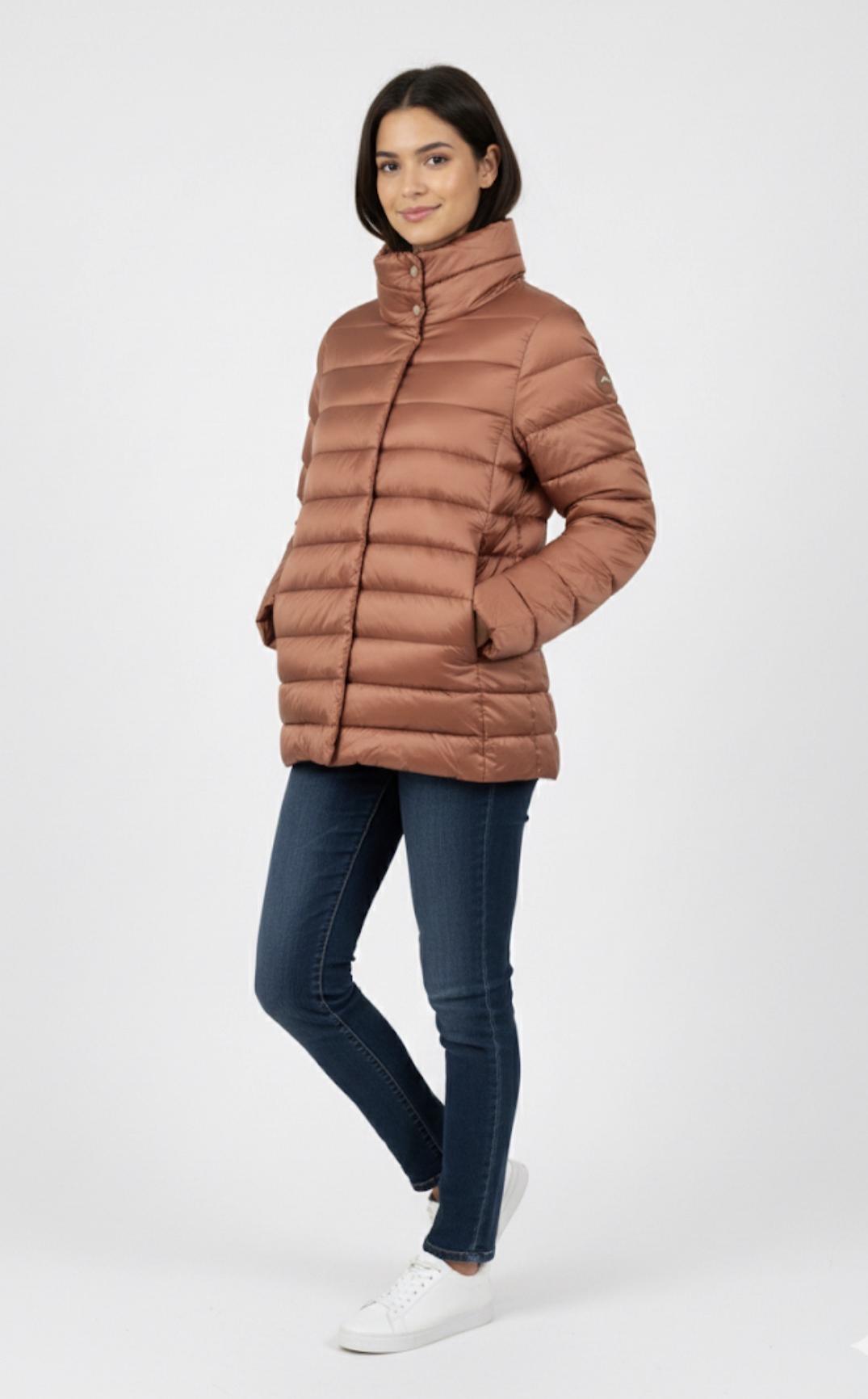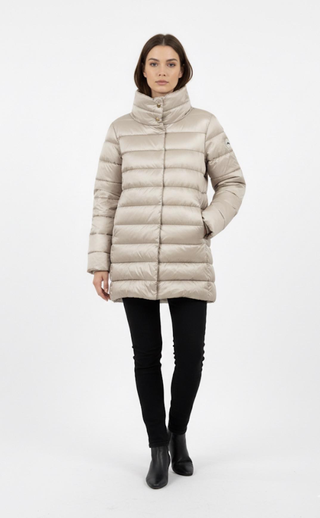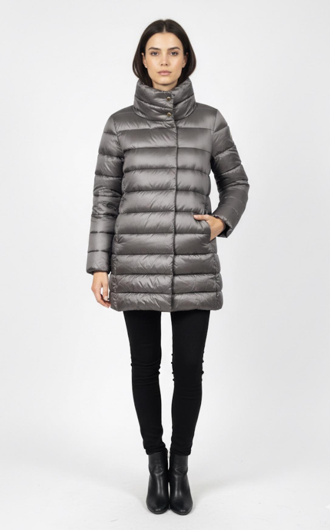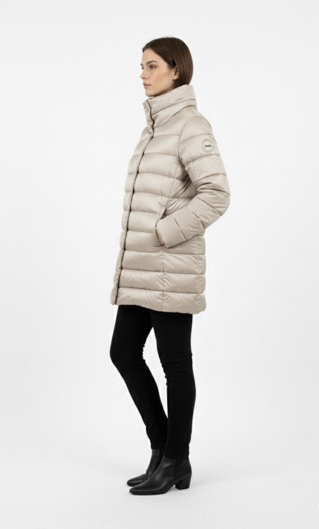 Parka acolchada larga con acabado metalizado. Cuello alto con cierre de botones a presión. Bolsillos laterales con costura oculta.
