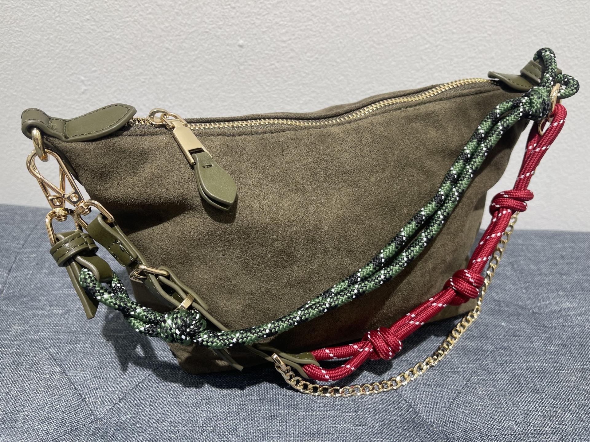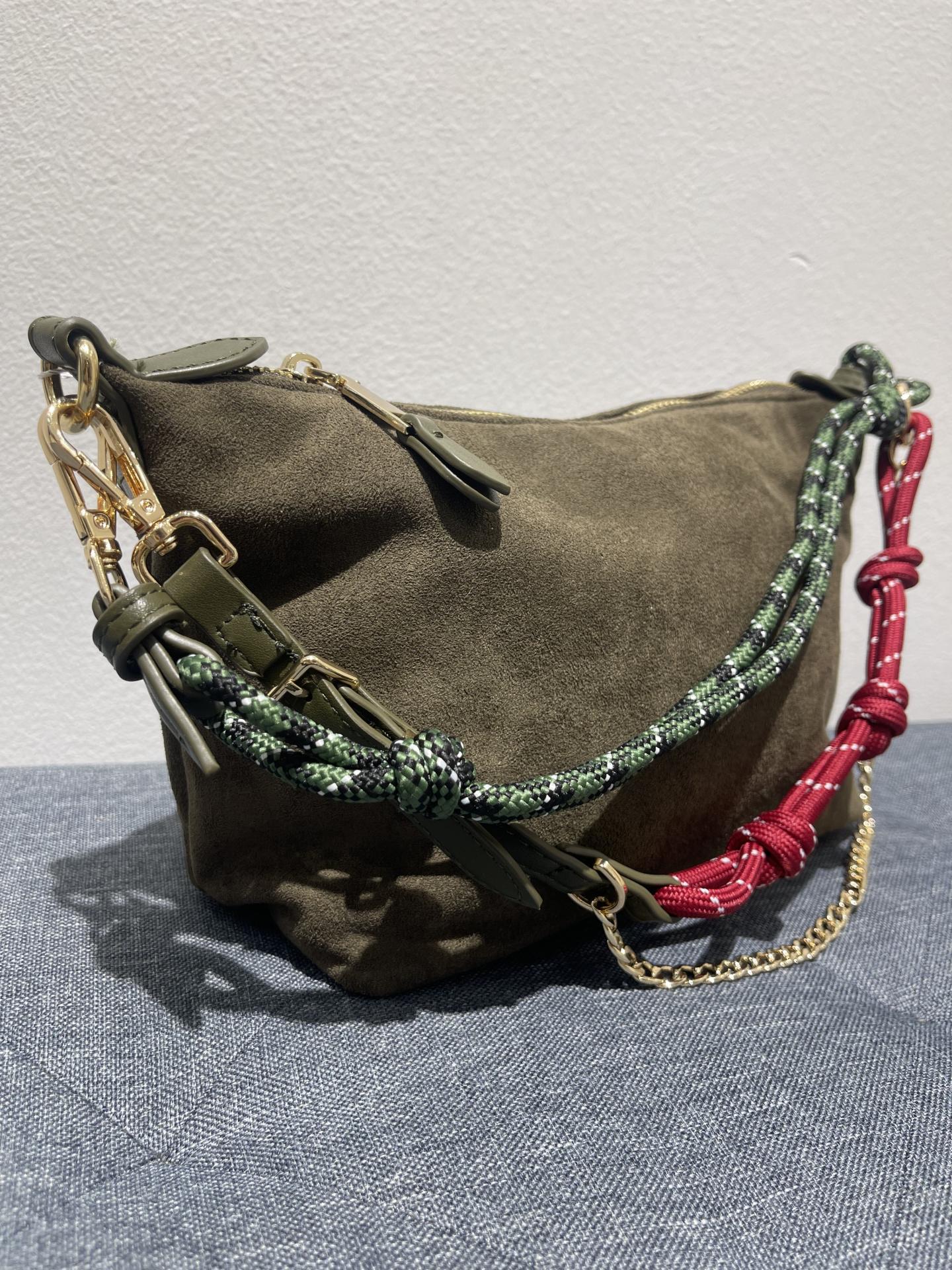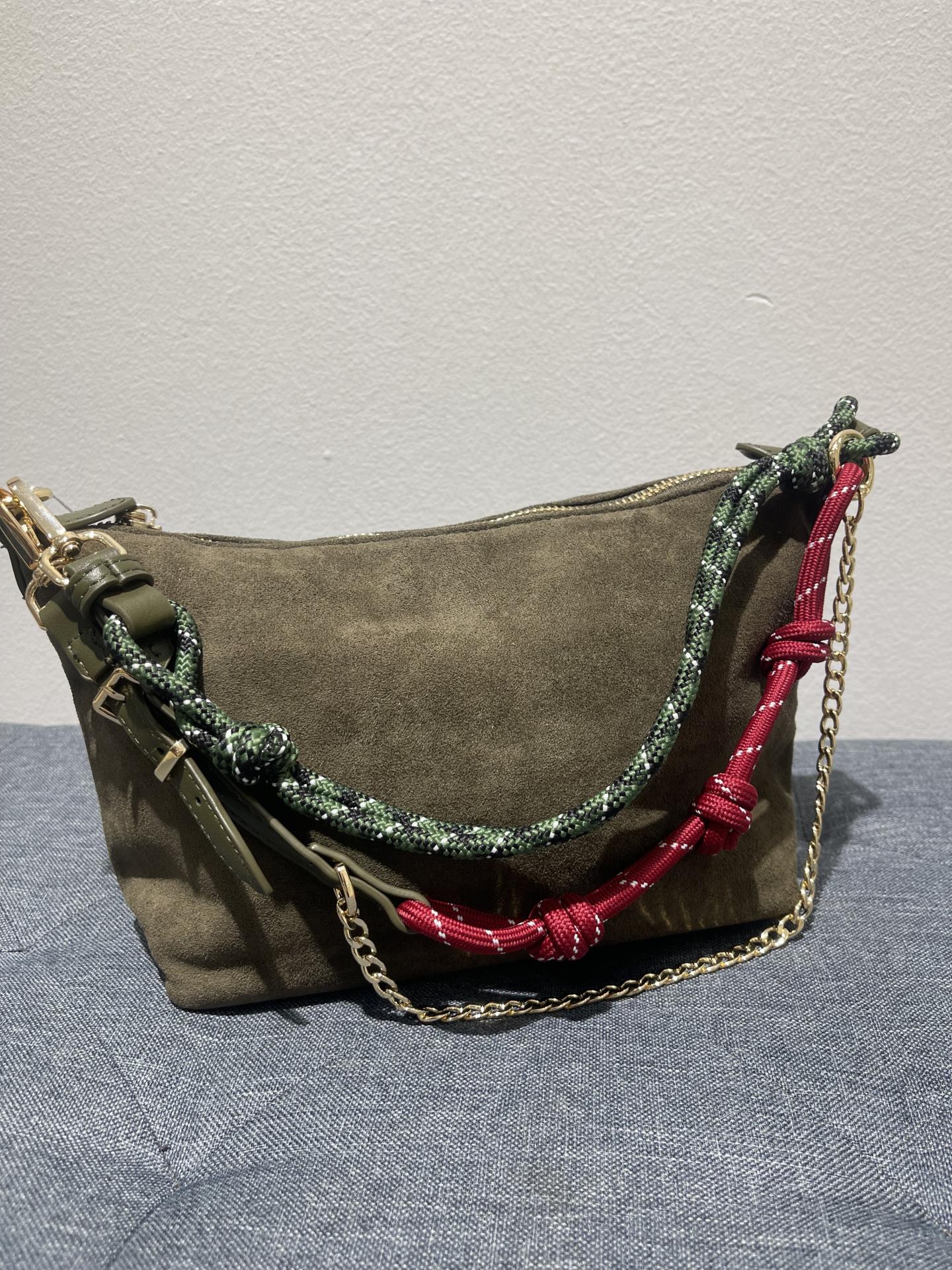 Bolso de mano en color verde oliva o caqui. Textura de antelina suave. Detalle de asa con cuerdas anudadas y cadena fina en dorado. Cierre de cremallera. Forro interior con bolsillo.
