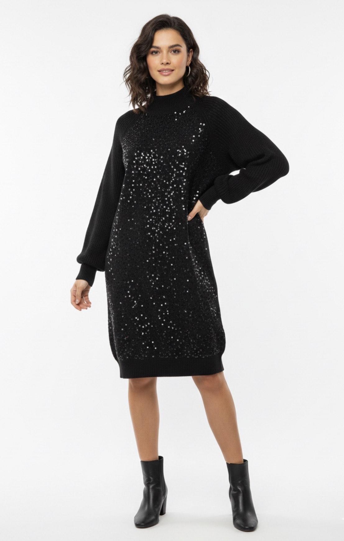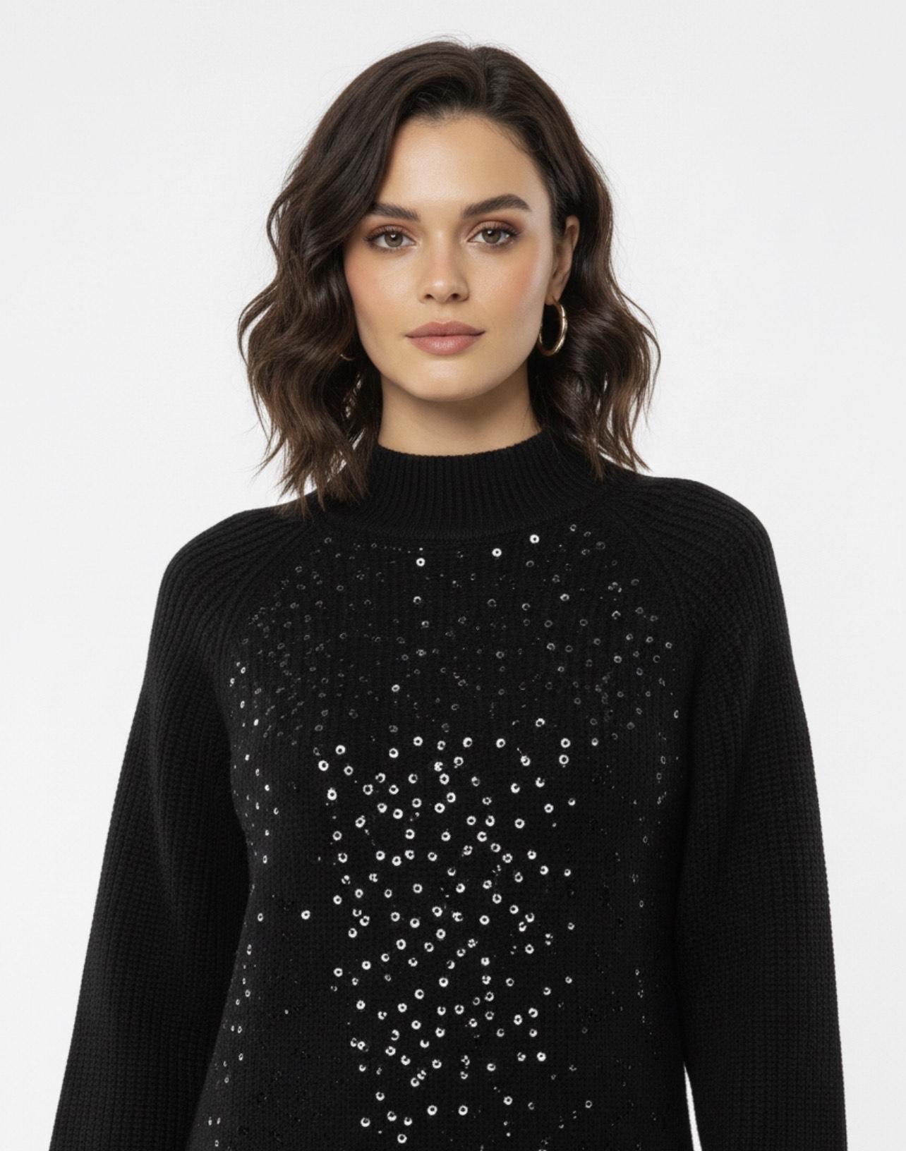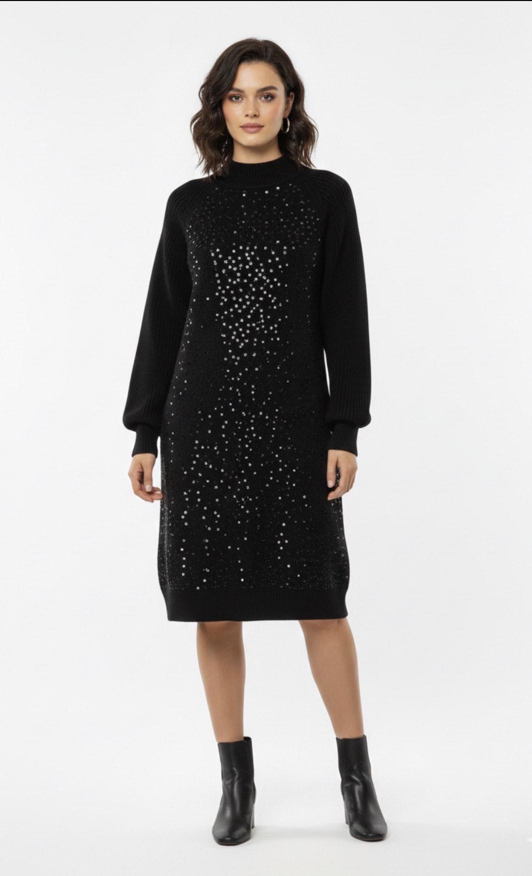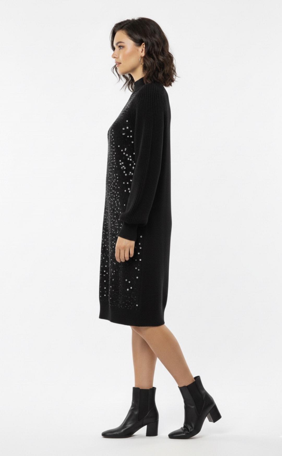 Vestido recto de tejido de punto. Cuello perkins y mangas abullonadas. Frontal delantero adornado con lentejuelas negras brillantes. Detalle del punto acanalado en cuello, puños y bajo.