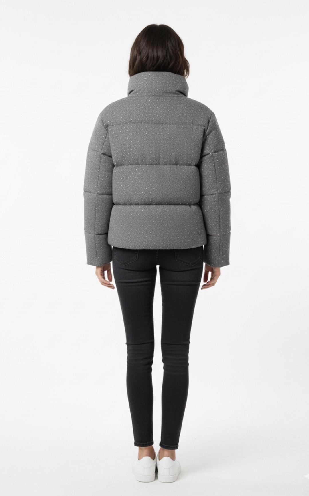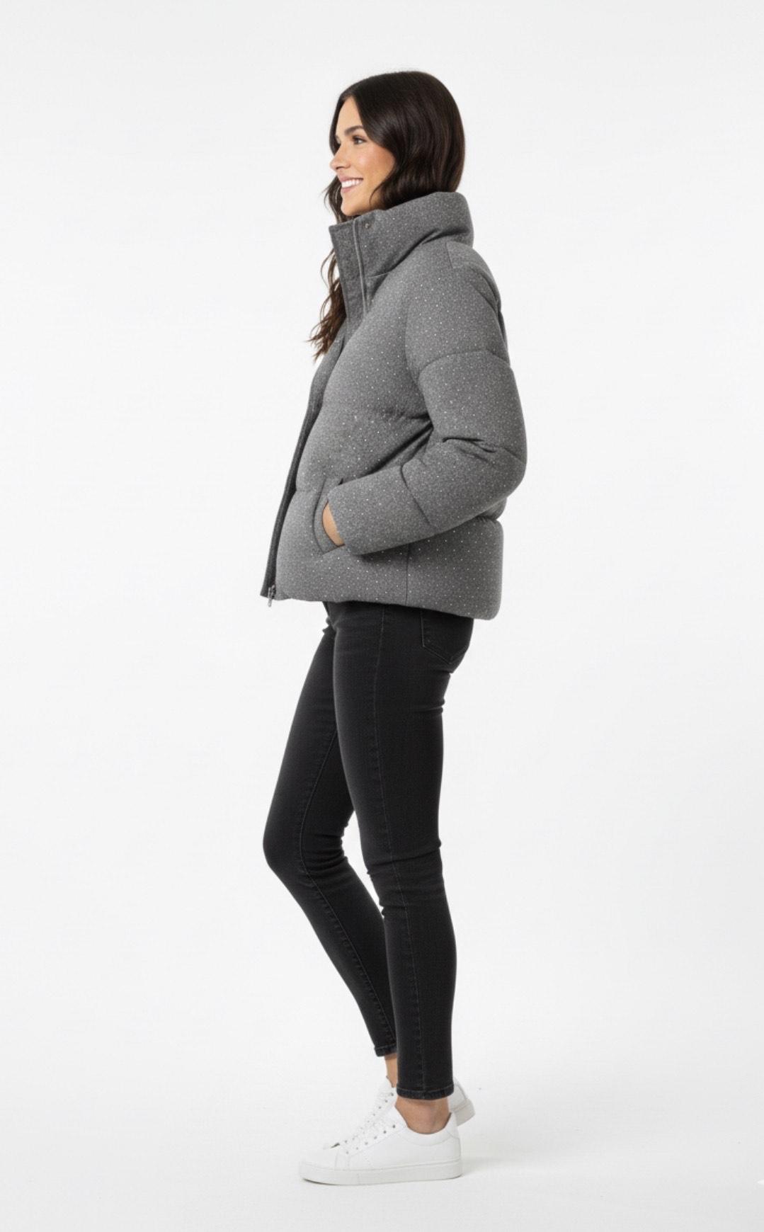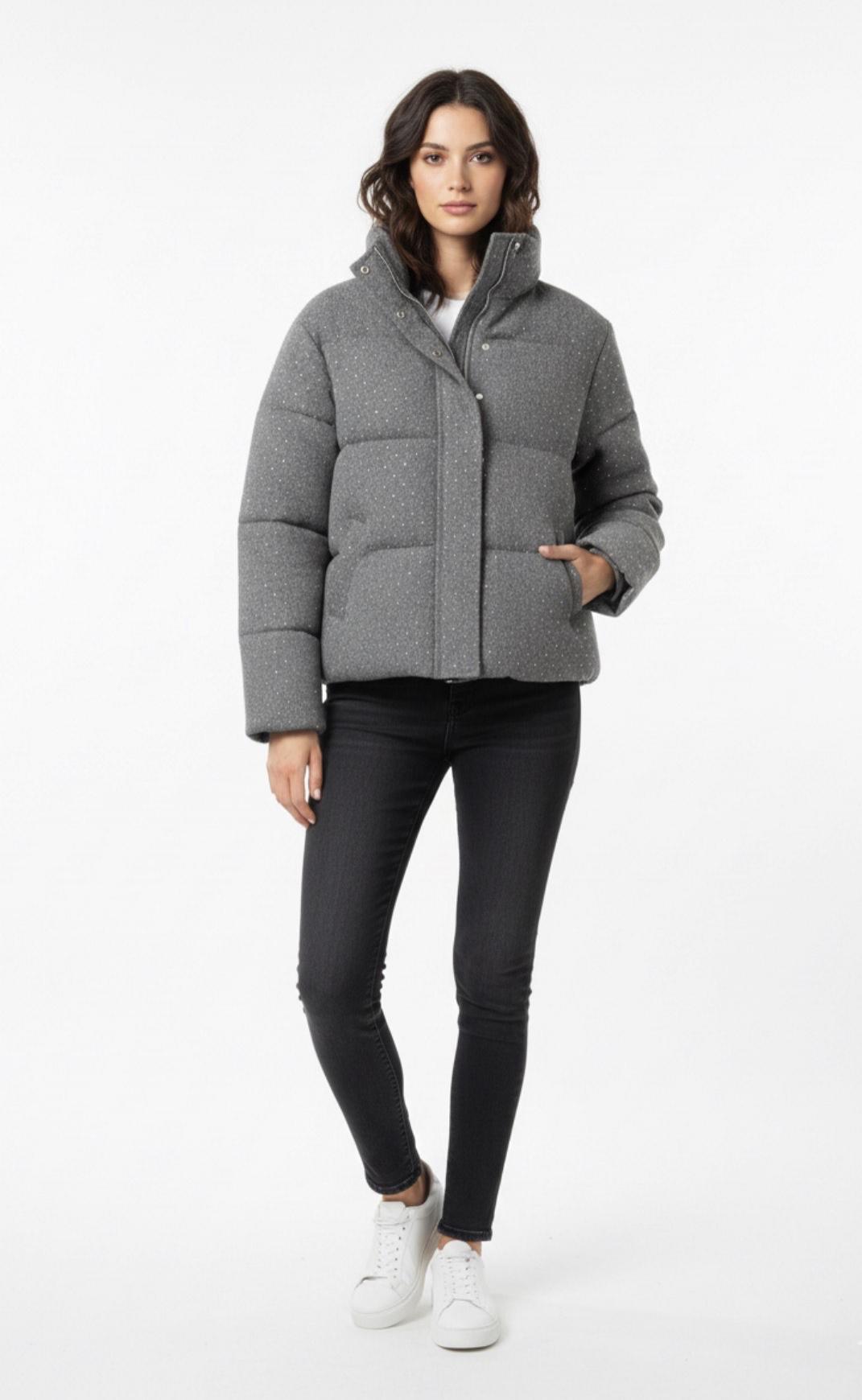 Abrigo corto acolchado con brillos de strass. Cierre frontal con cremallera y botones de presión ocultos. Incluye bolsillos en los laterales. Forro interior.