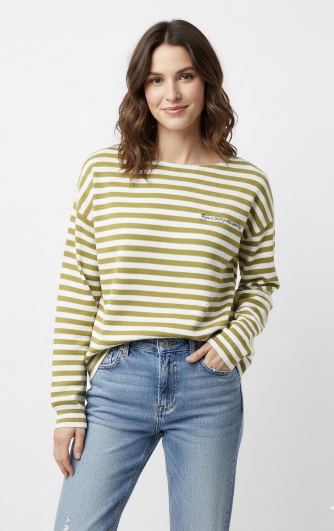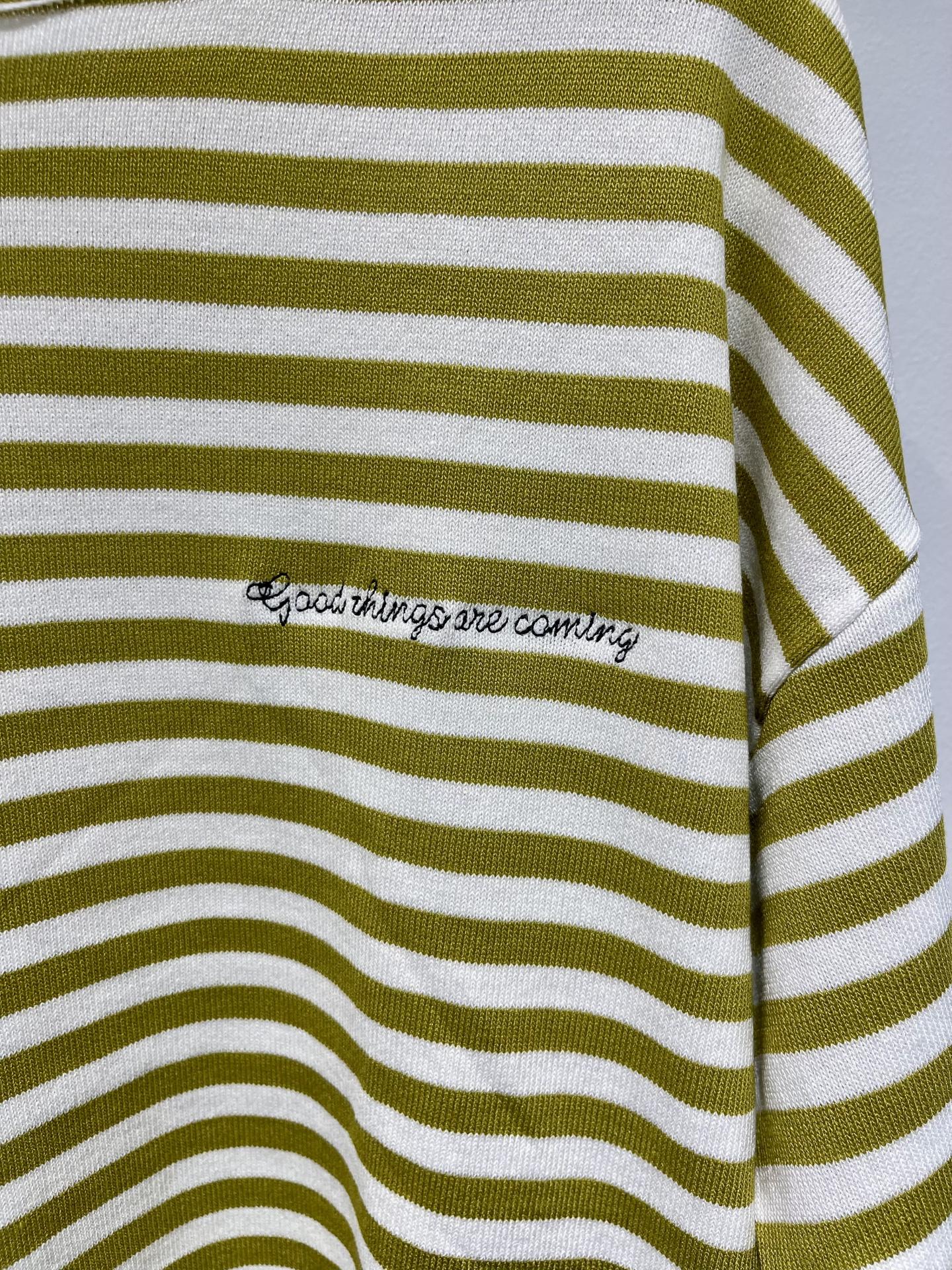 Suéter de punto fino con estampado a rayas en tonos verde lima y blanco. Bordado en caligrafía con frase "Good things are coming". Cuello redondo y mangas con hombros caídos. Acabados acanalados en puños y en el bajo. Diseño oversize.
