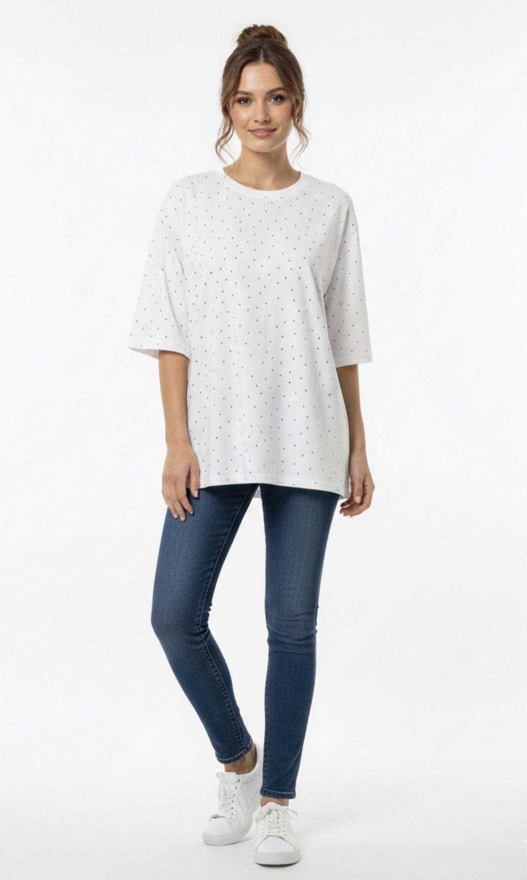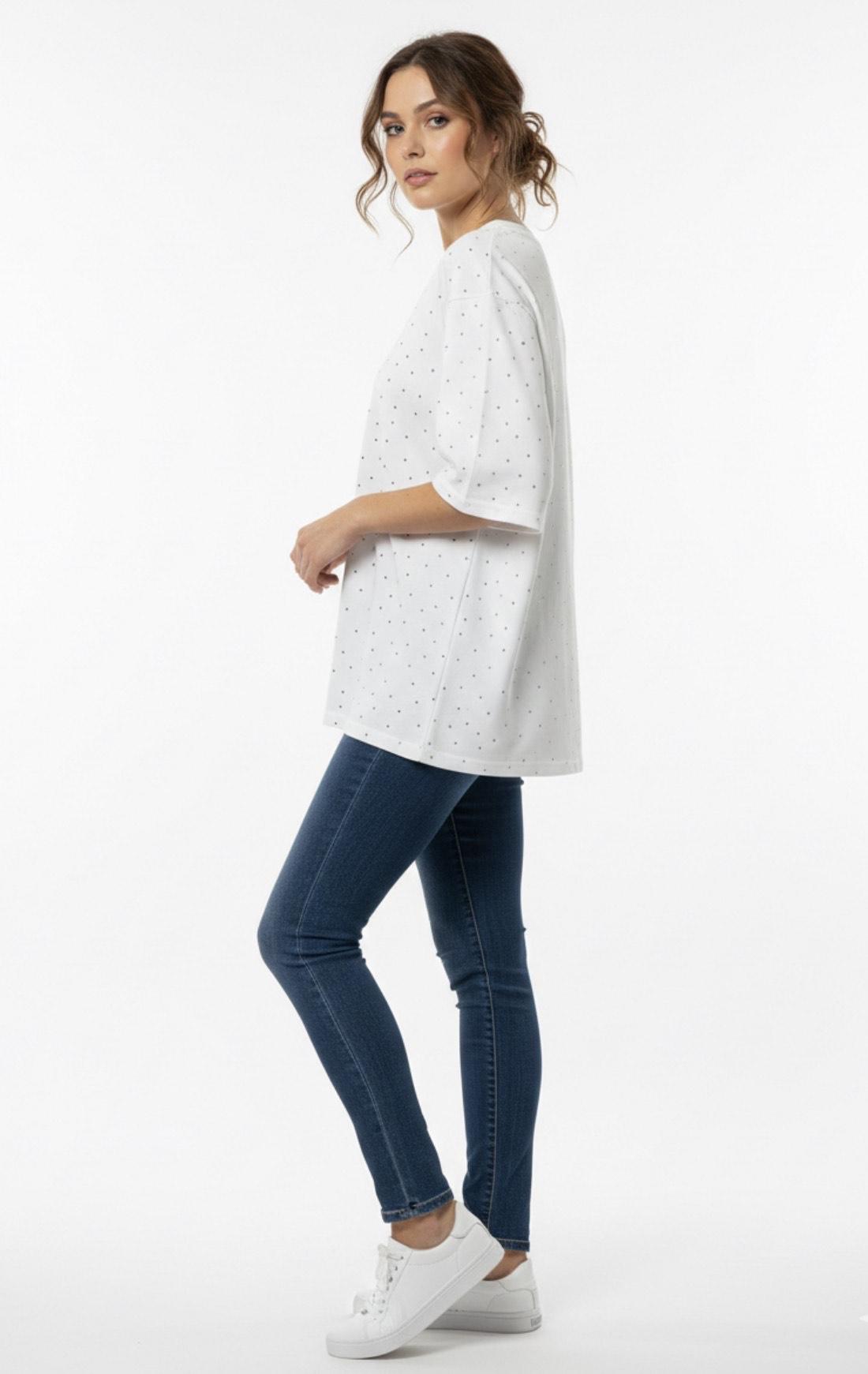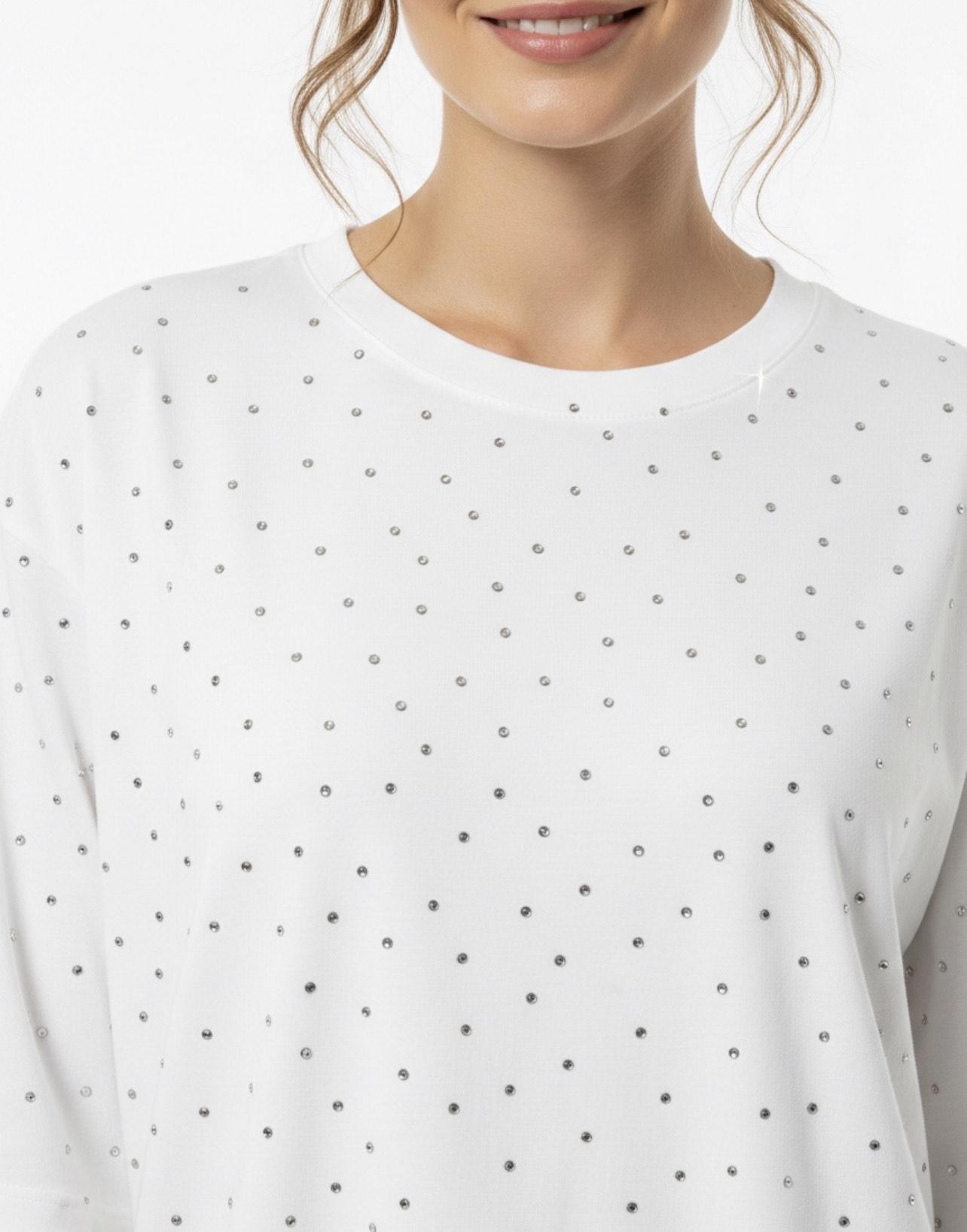 Camiseta oversize con cuello redondo. Detalle de strass brillantes por toda la prenda. Corte relajado con hombros caídos.