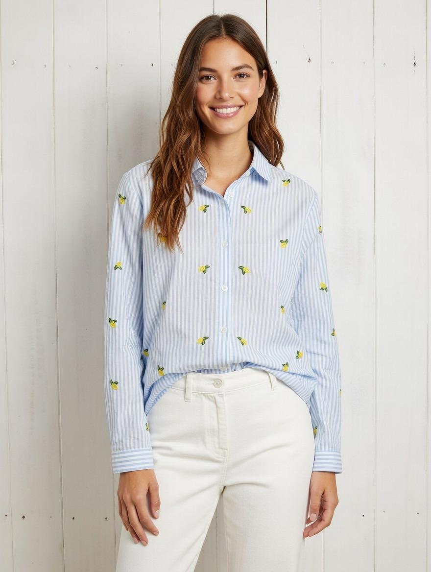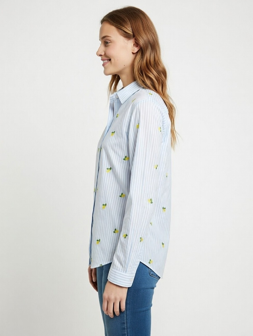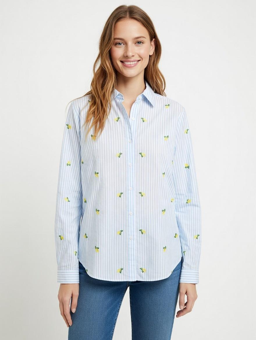 Camisa básica a rayas con limones bordados. Tejido ligero y fresco. Talle amplio.