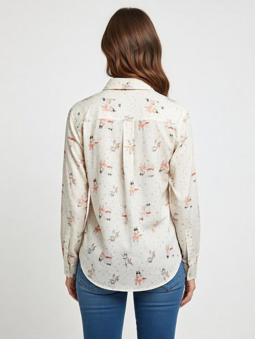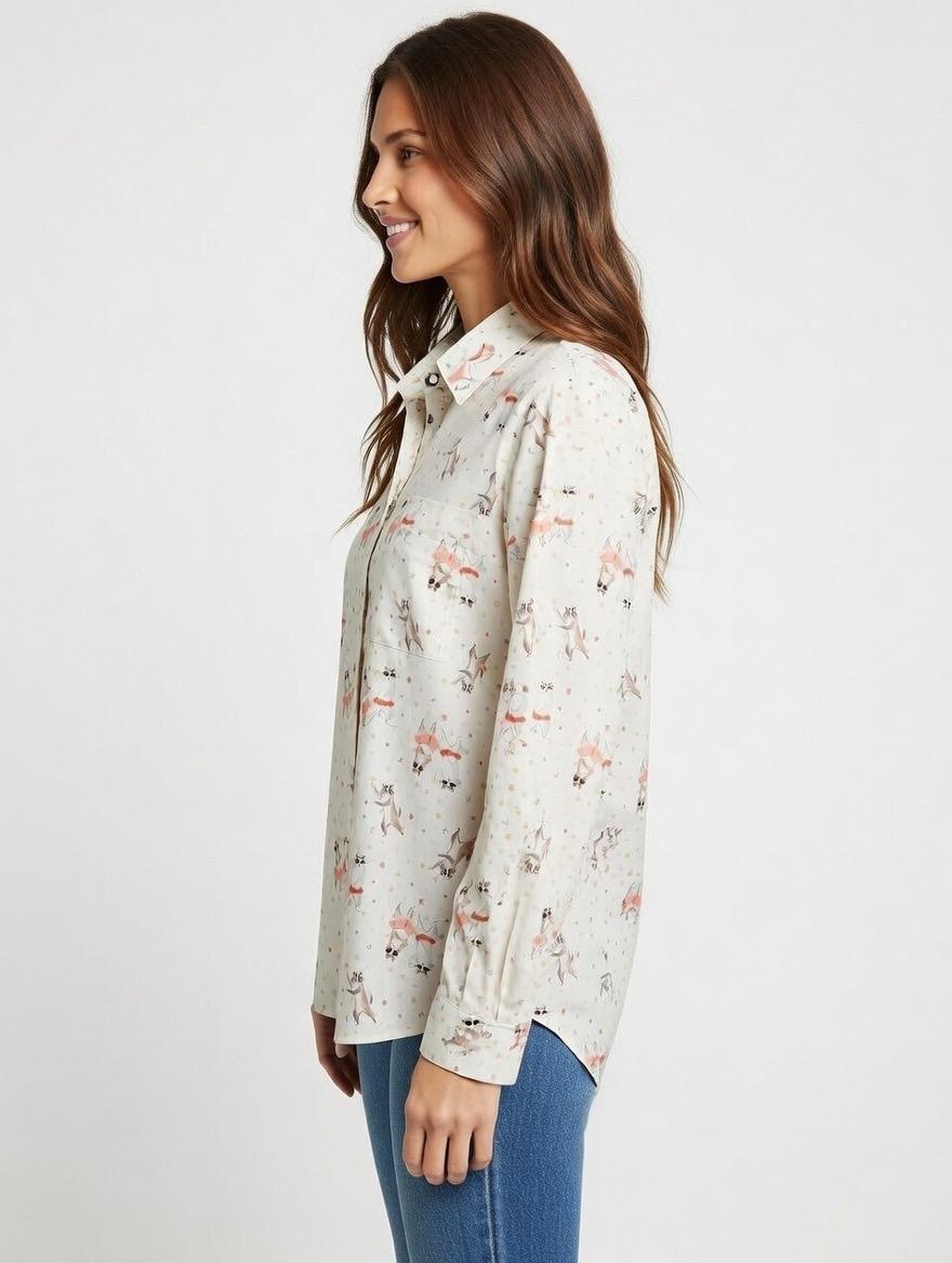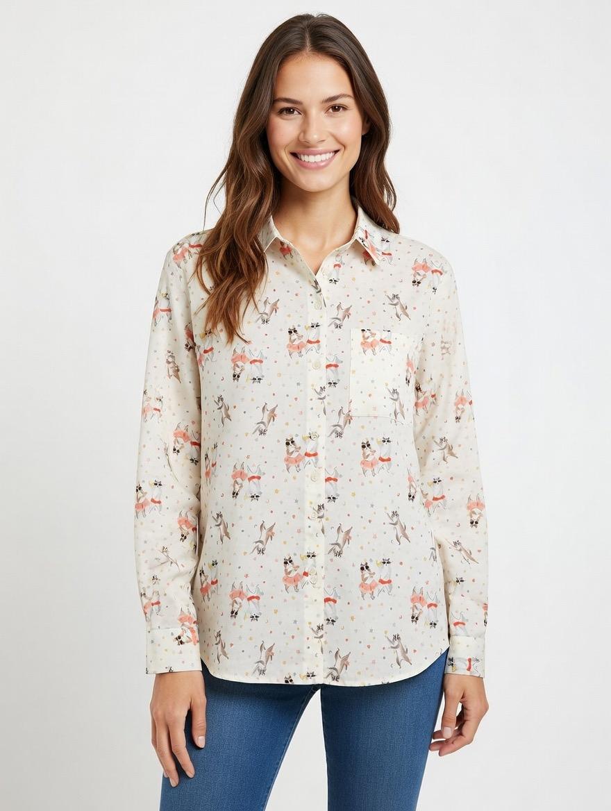 Camisa básica con estampado de gatos y corazones. Bolsillo en el pecho.