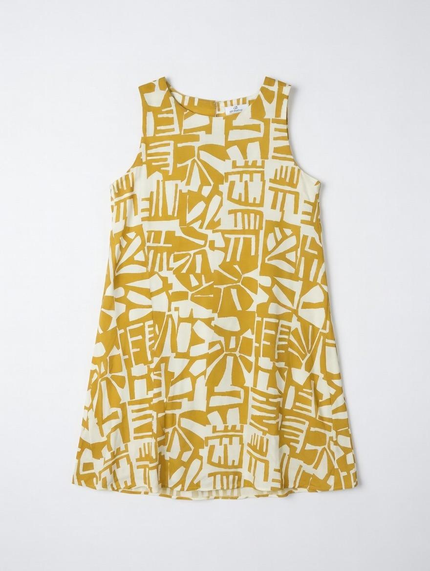 Vestido corto de tirantes con estampado en color mostaza. Forma trapecio. Tejido fresco y ligero.