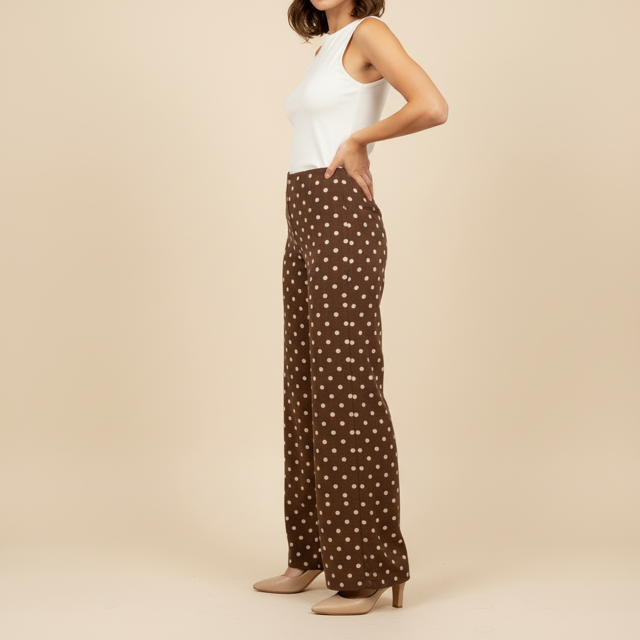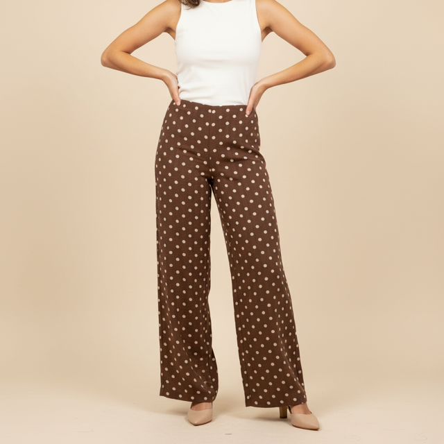 Pantalón de pierna ancha color chocolate con lunares en beige. Cremallera invisible en un costado. Forro interior. Tejido fino y ligero.