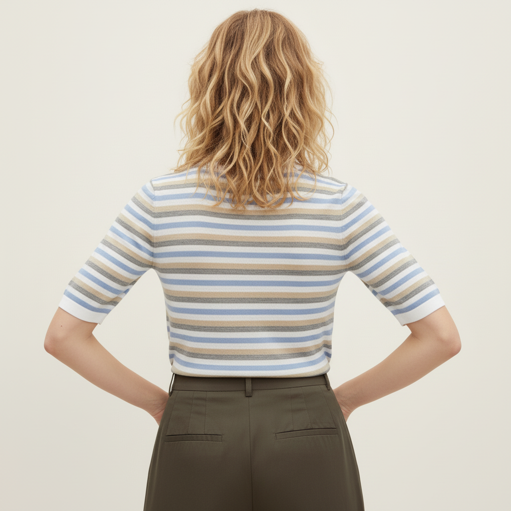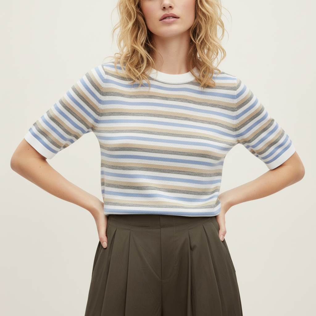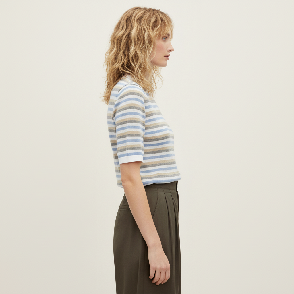 Suéter de punto fino suave con cuello redondo y de media manga. Estampado a rayas en tonos beige arena, azul suave y gris.