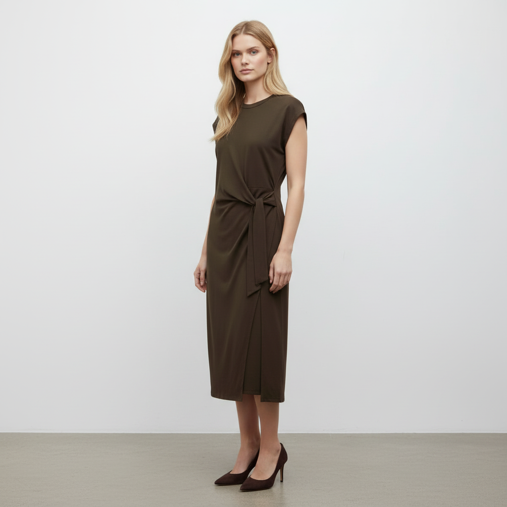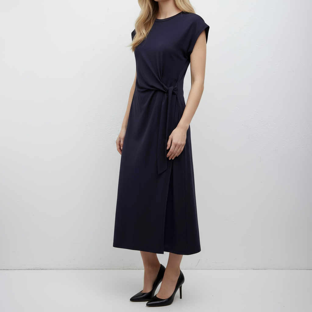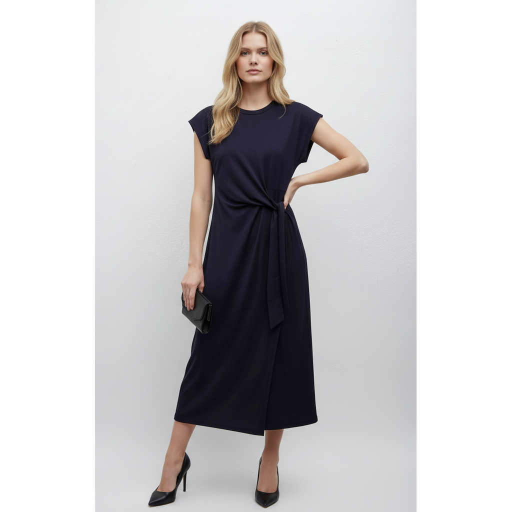 Vestido de largo midi con cuello redondo y manga corta. Detalle de nudo o lazada lateral en la cintura que crea un efecto drapeado.