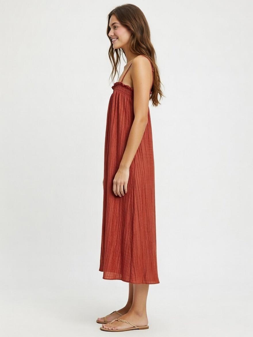 Vestido de tirantes de tejido arrugado. Tejido fino y ligero. Goma elástica en escote.