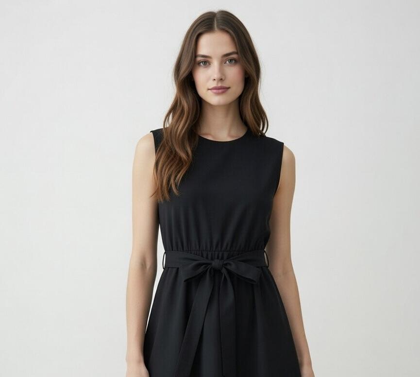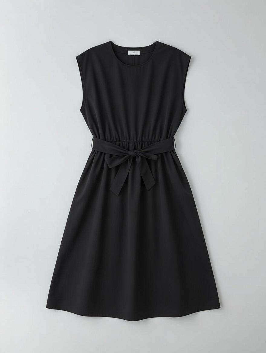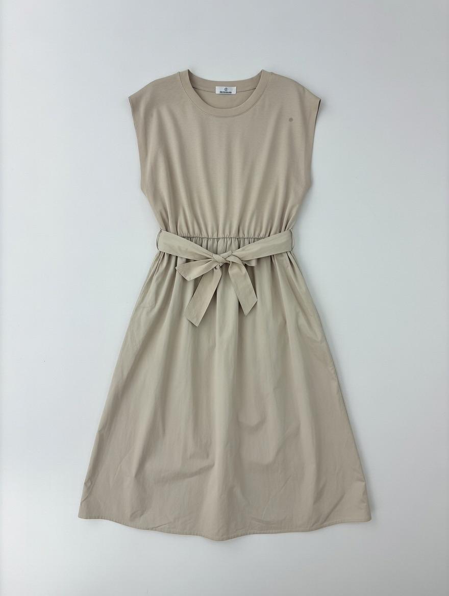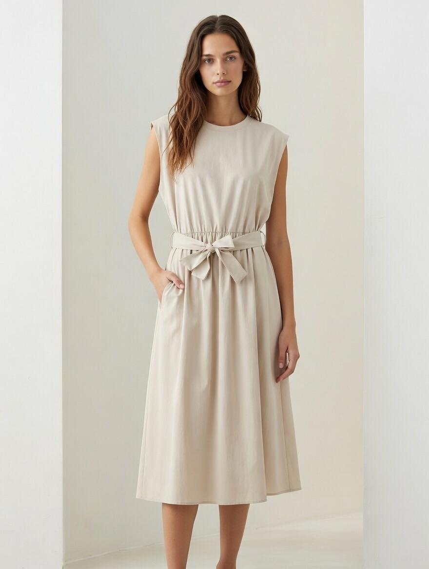 Vestido midi sin mangas de dos tejidos distintos mismo color. Tiene cinturón y bolsillos.