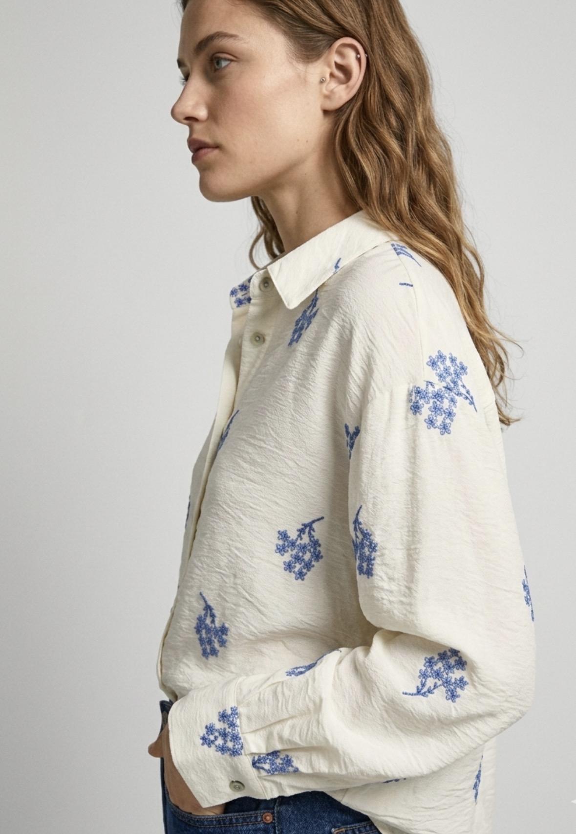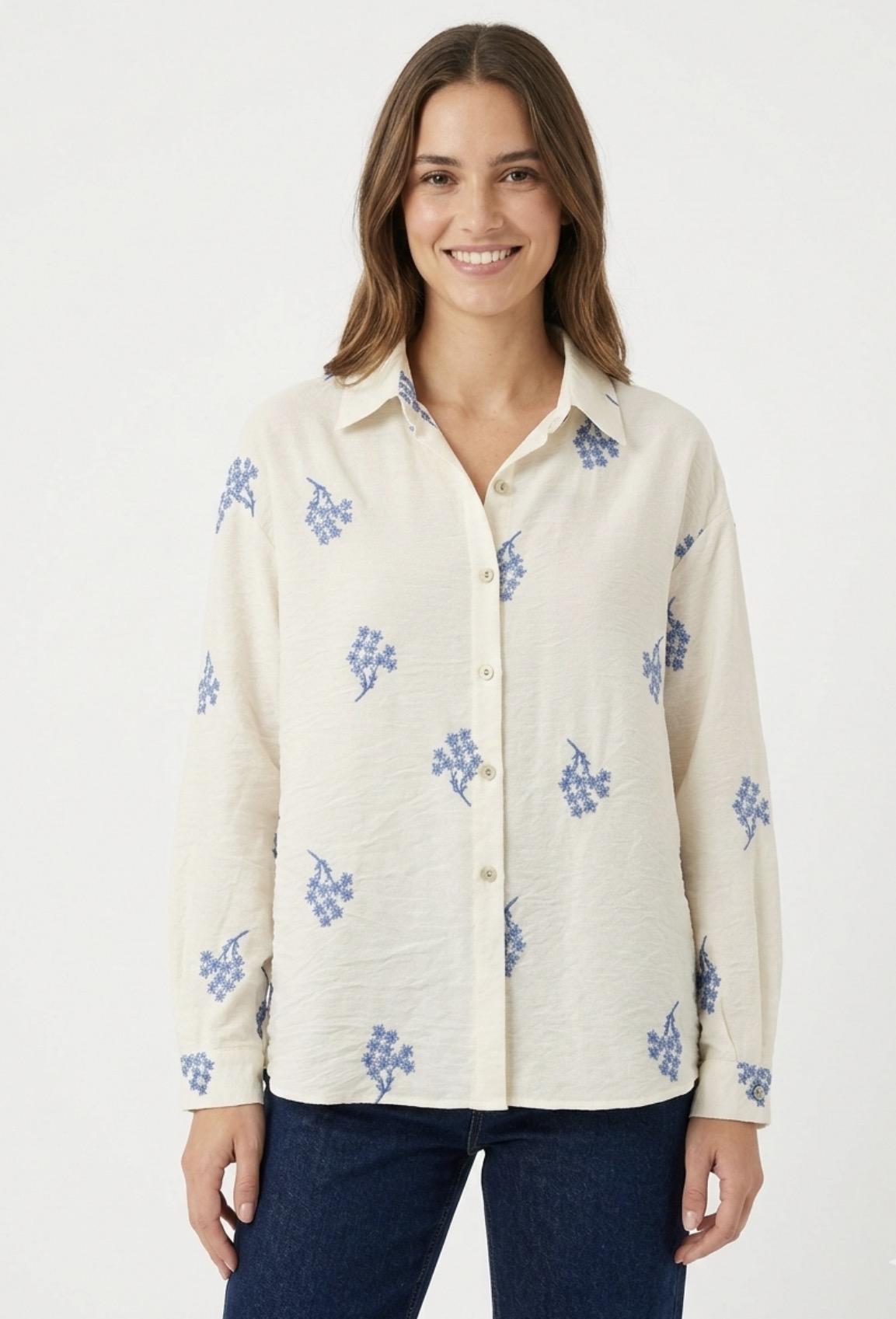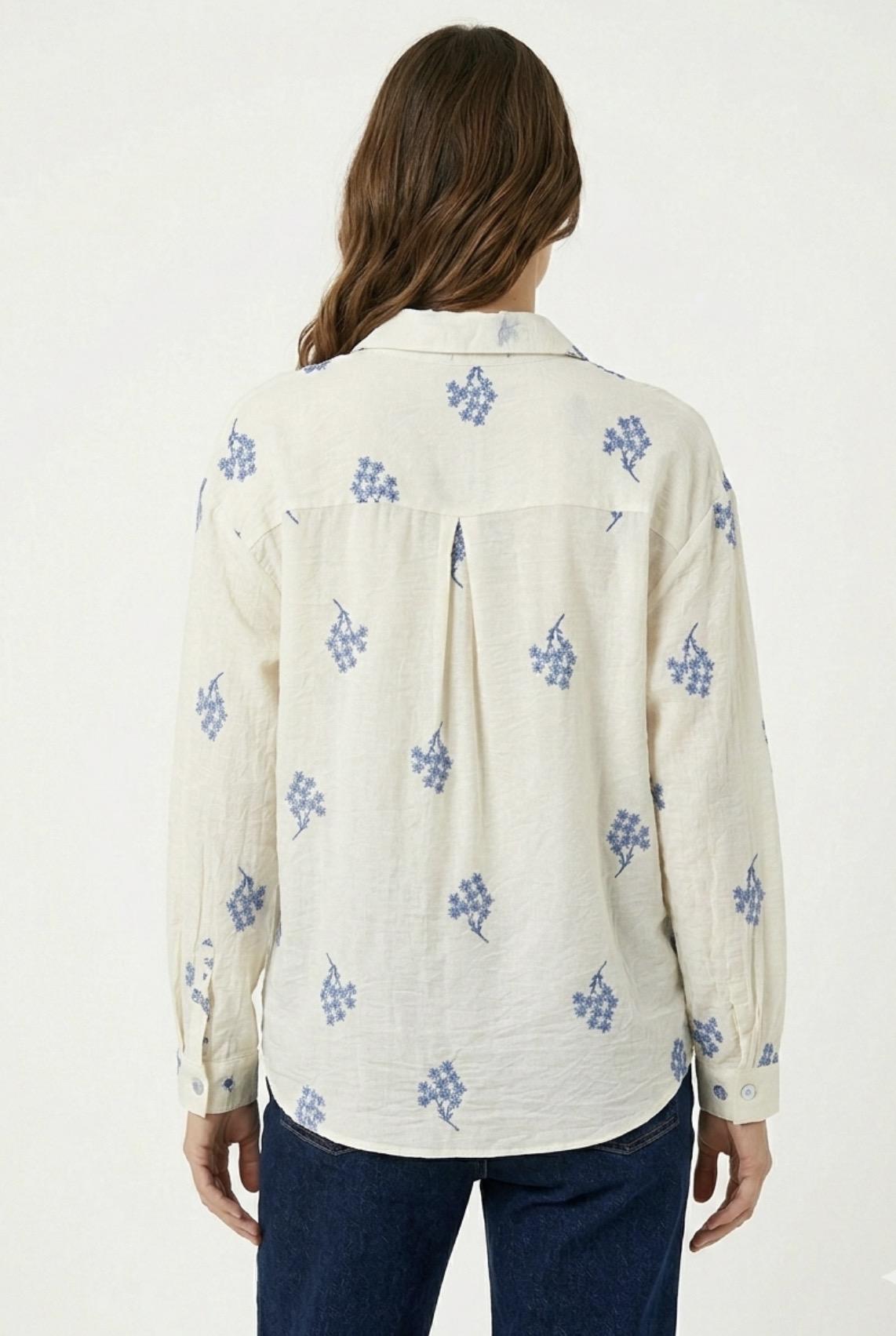 Camisa de manga larga y cuello camisero. Detalle de pequeños ramos de flores bordadas en en color azul. Corte relajado con hombros caídos. Cierre de botones anacarados.
