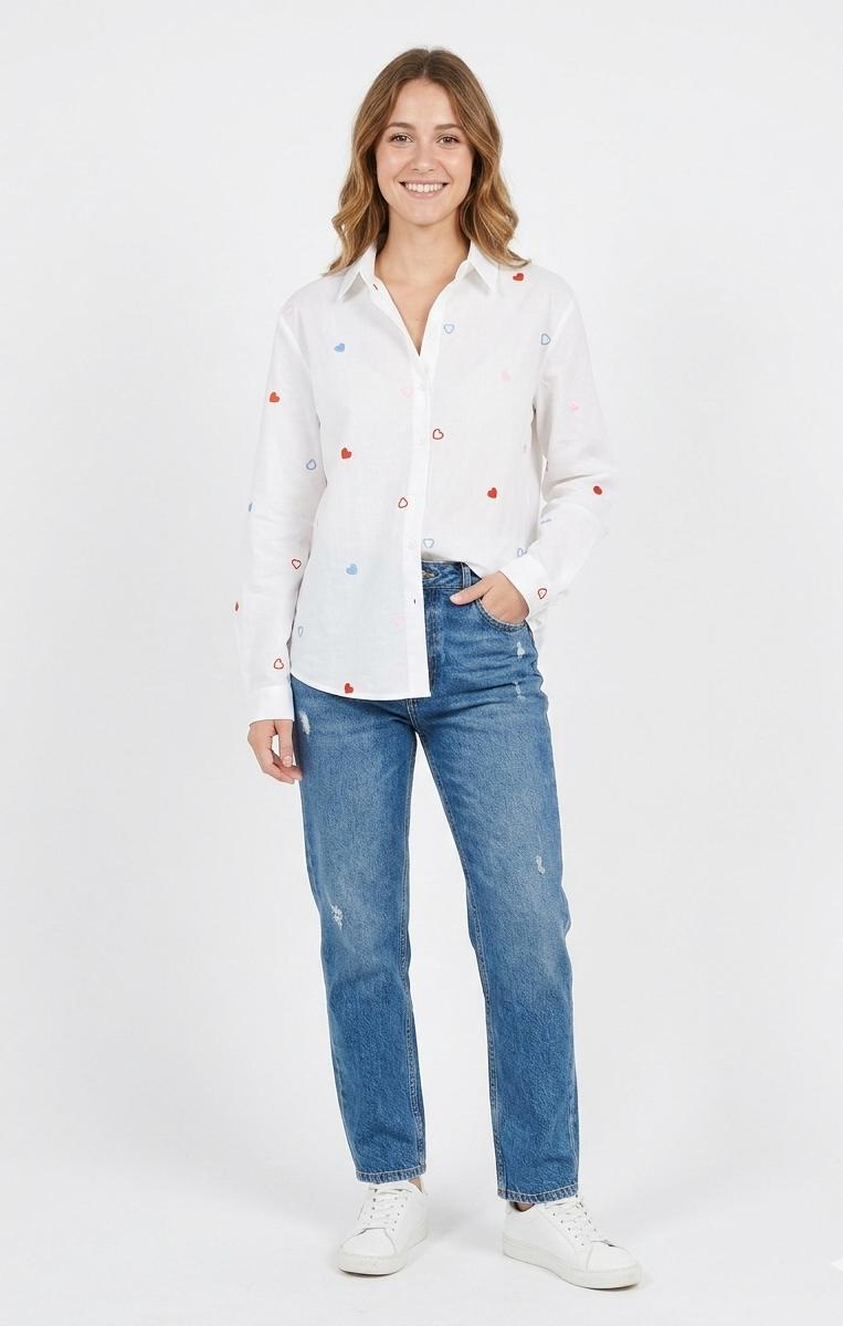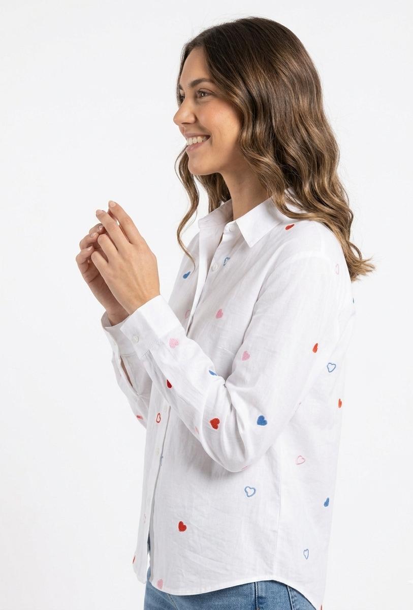 Camisa de manga larga y cuello camisero. Corte recto y holgado. Detalle de corazones bordados de colores. Cierre de botones en frontal y puños.