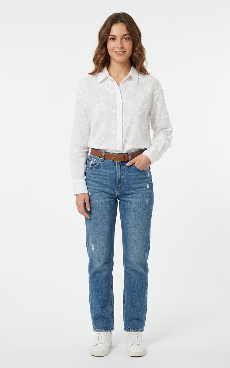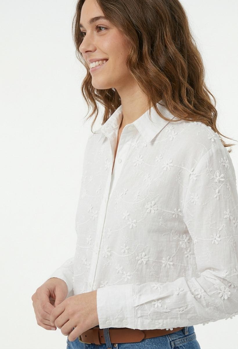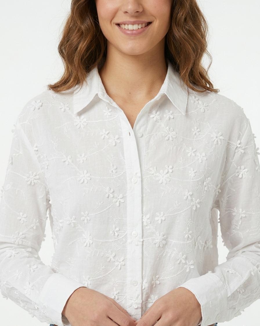 Camisa de manga larga y cuello camisero. Toda la prenda está decorada con un intrincado patrón floral bordado en color blanco sobre blanco. Presenta detalles de flores en relieve. Corte recto y holgado. Cierre de botones frontal y en puños.