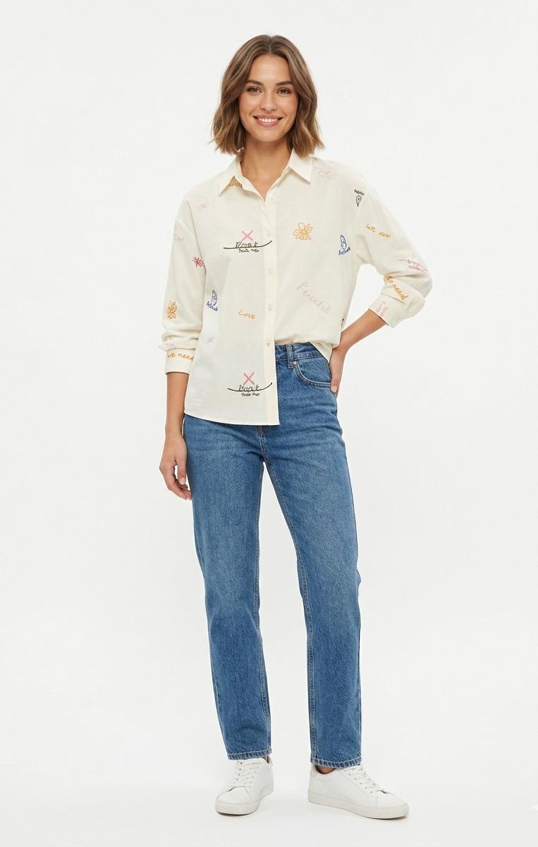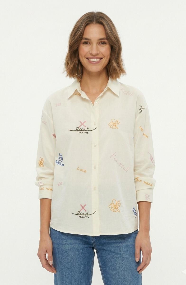 Camisa de manga larga y cuello camisero. Detalles de bordados con mensajes y símbolos. Corte recto y holgado. Cierre de botones en la parte frontal y en puños.