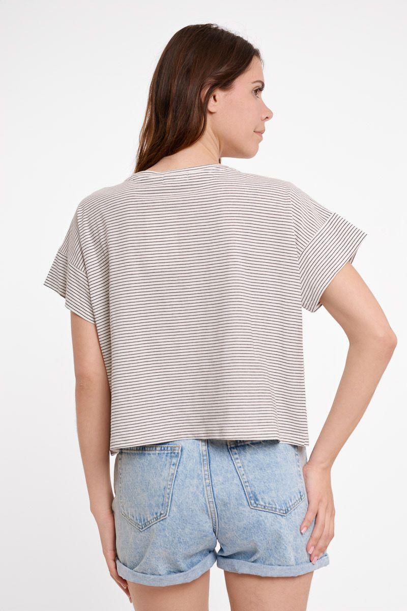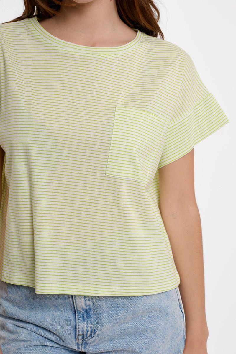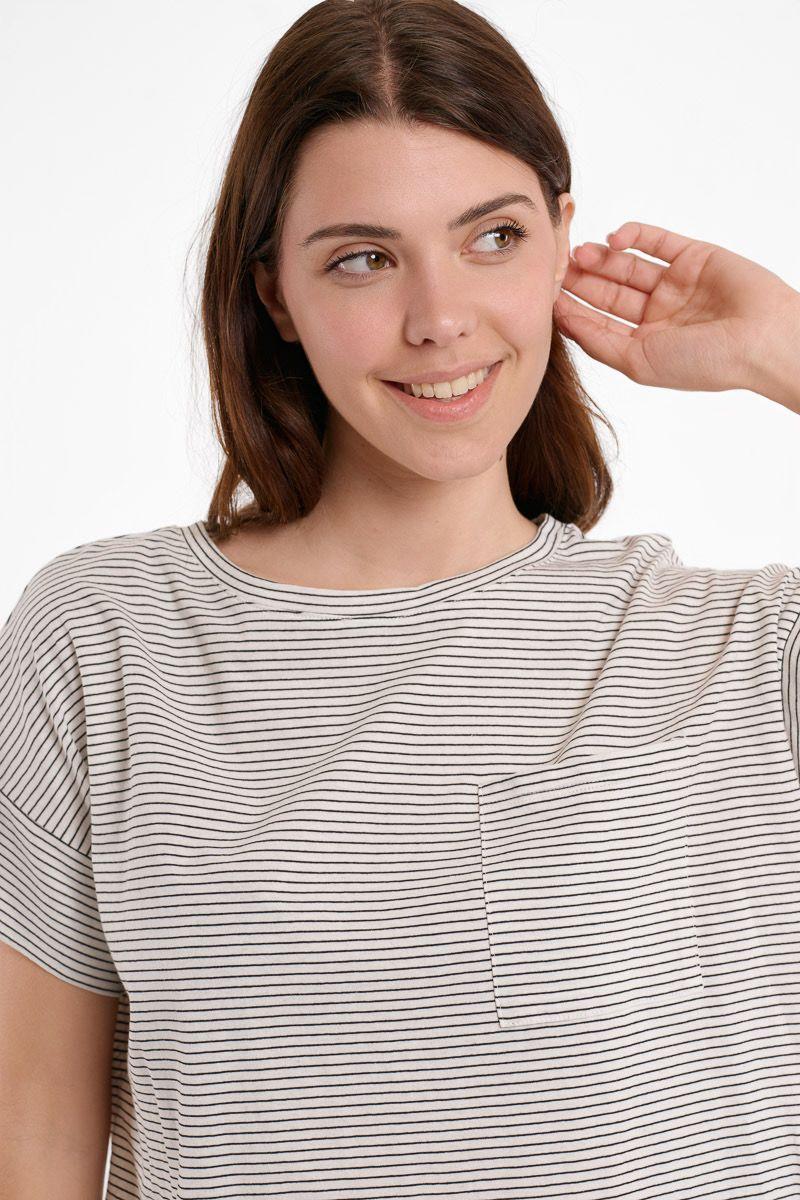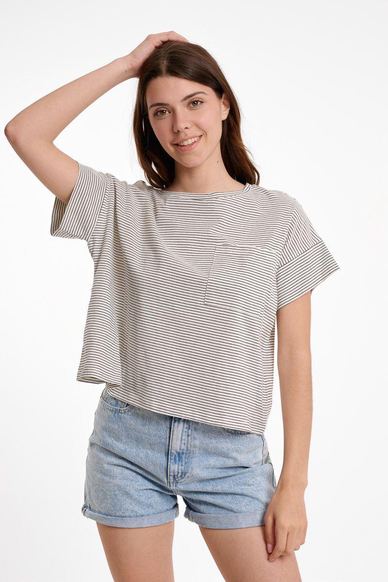Camiseta crop de manga corta y cuello redondo. Diseño cuadrado y oversize. Estampado de rayas muy finas. Bolsillo de parche en el lateral.