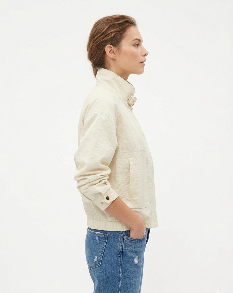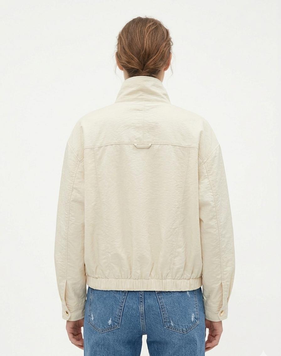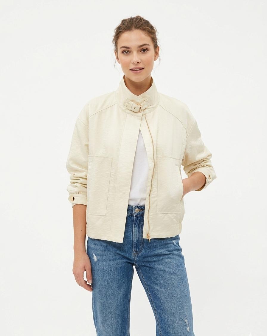 Chaqueta bomber de manga larga y cuello alto. Diseño oversize. Cuello alto que se puede cerrar mediante una correa ajustable con hebilla metálica en acabado dorado. Cierre de cremallera y bolsillos en los laterales. Los puños son anchos y cuentan con botones automáticos metálicos dorados para un ajuste personalizado. La parte posterior de la cintura incluye una banda elástica fruncida. Forro interior. Color lima.