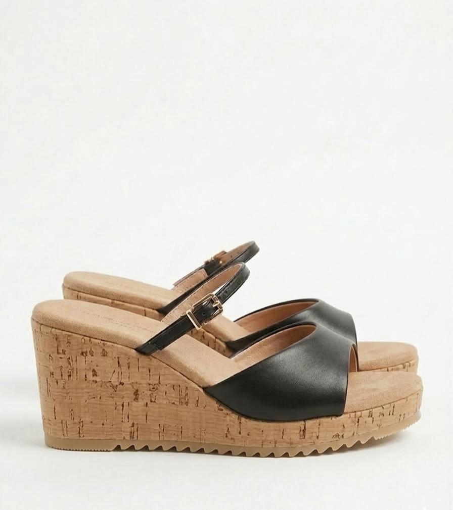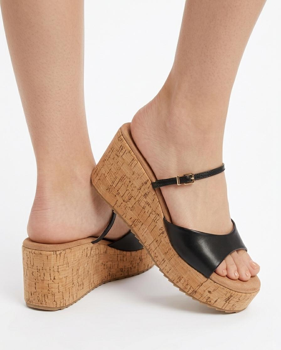 Sandalias de cuña recubierta de corcho natural con un acabado texturizado. Cuenta con una tira ancha de cuero sintético negra que sujeta la parte delantera del pie. Incluye una tira fina que rodea el empeine, asegurándose con una hebilla metálica rectangular en color dorado. Plantilla acolchada.