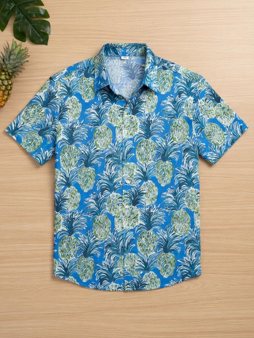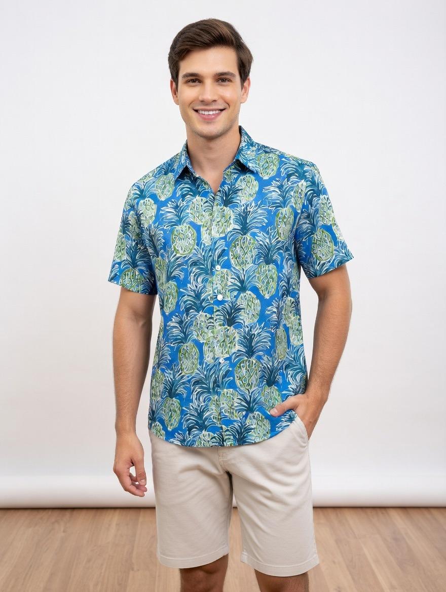 Camisa Hawaiana de hombre con estampado de piñas. Tejido fresco y ligero.