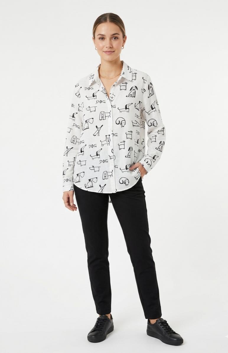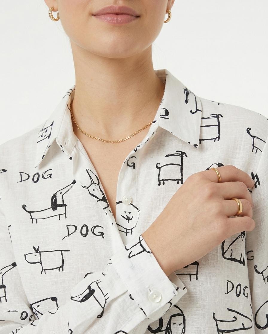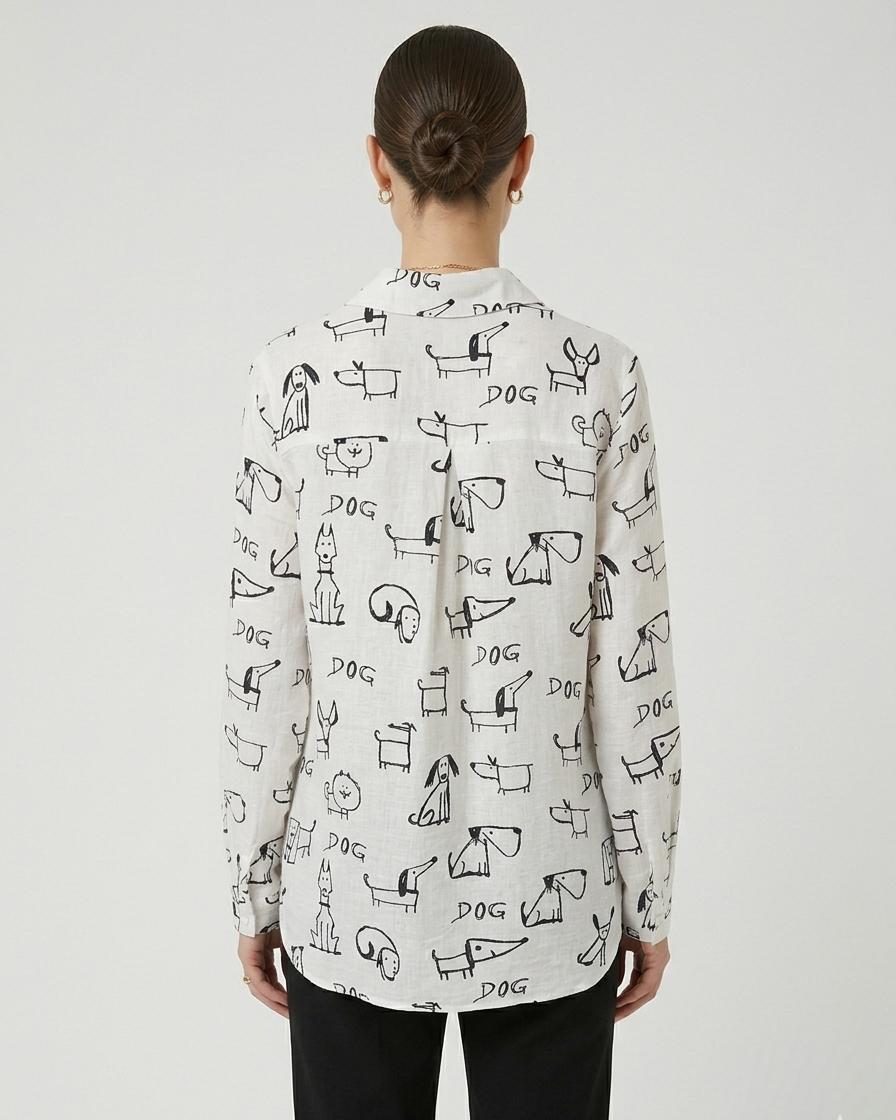 Camisa de manga larga y cuello camisero. Estampado de perros dibujados en trazos negros. Corte oversize. Cierre de botones en la parte frontal y en puños anacarados. Incluye una trabilla con botón en la manga, permitiendo remangarla de forma fija y cómoda para un estilo más casual y relajado.