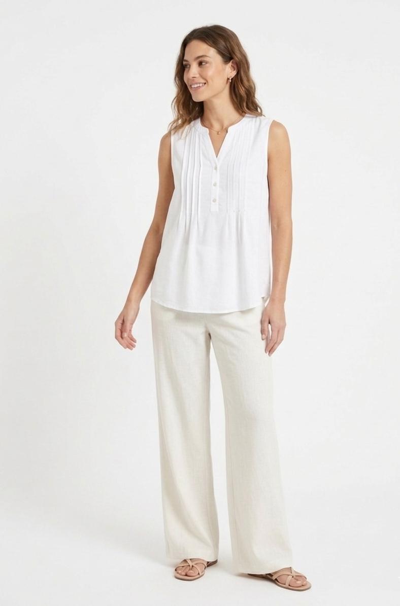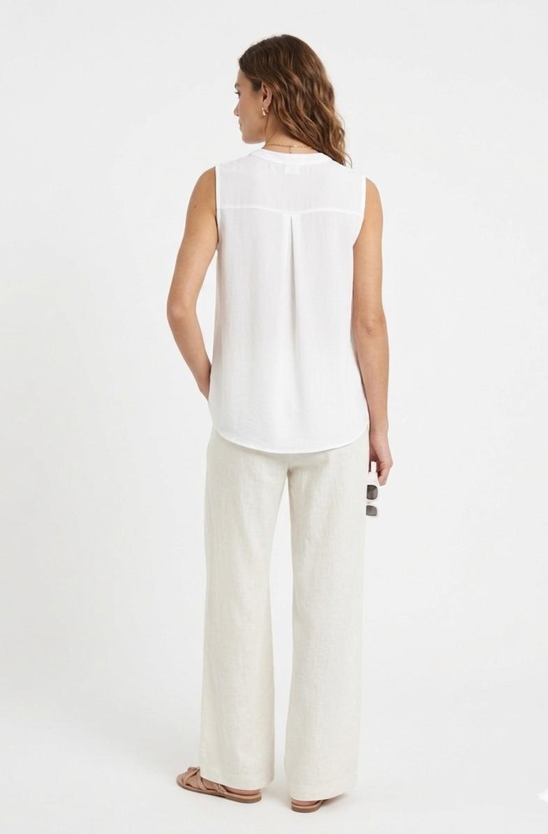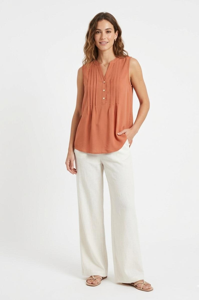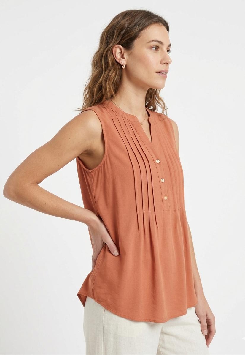 Blusa sin mangas con cuello mao y escote acabado en pico. El frontal destaca unos pliegues finos cosidos a ambos lados de la botonadura. Tejido ligero y con caída. La parte posterior incluye un canesú horizontal del que nace un tablón central (pliegue), permitiendo que la tela caiga con mayor amplitud y no se pegue al cuerpo.
