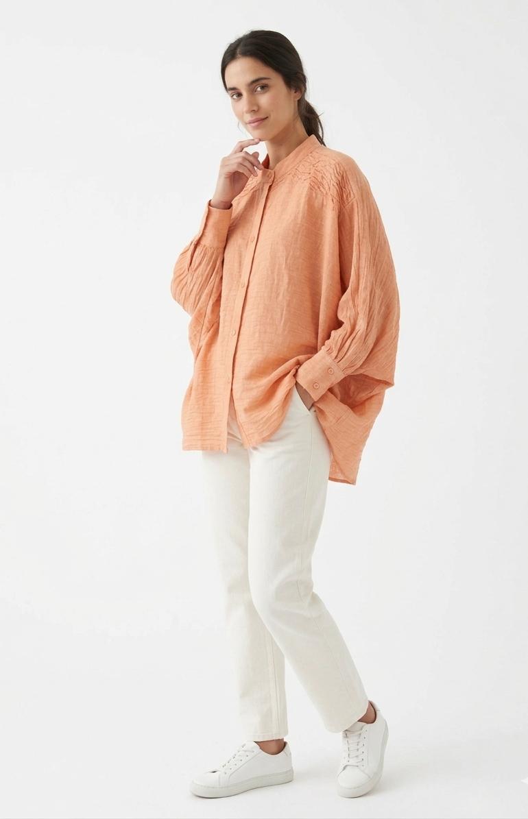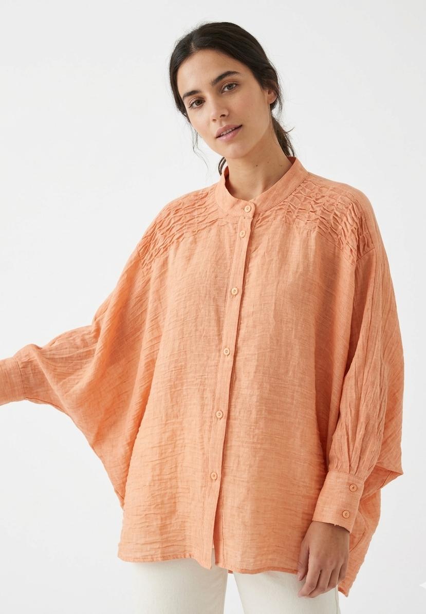 Blusa oversize de silueta amplia y fluida con manga larga efecto murciélago. Cuello mao con cierre de botones en la parte frontal y en los puños. Detalle de plisado o nervaduras en la zona de los hombros y el canesú. Bajo irregular con caída lateral pronunciada (tipo picos).