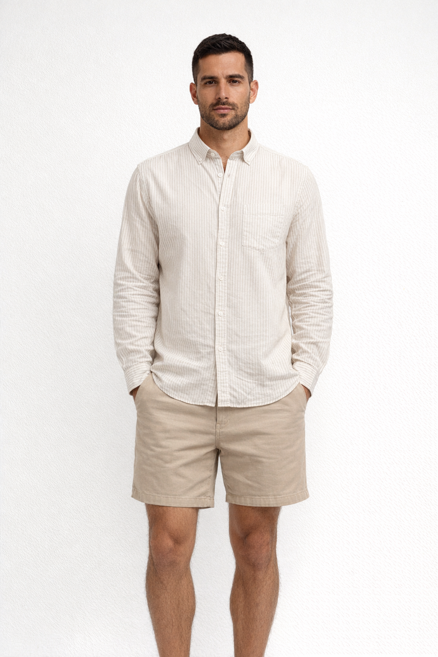 Camisa de talle recto con cuello abotonado y bolsillo en el pecho. Tejido ligero y fresco. Raya en color beige claro.