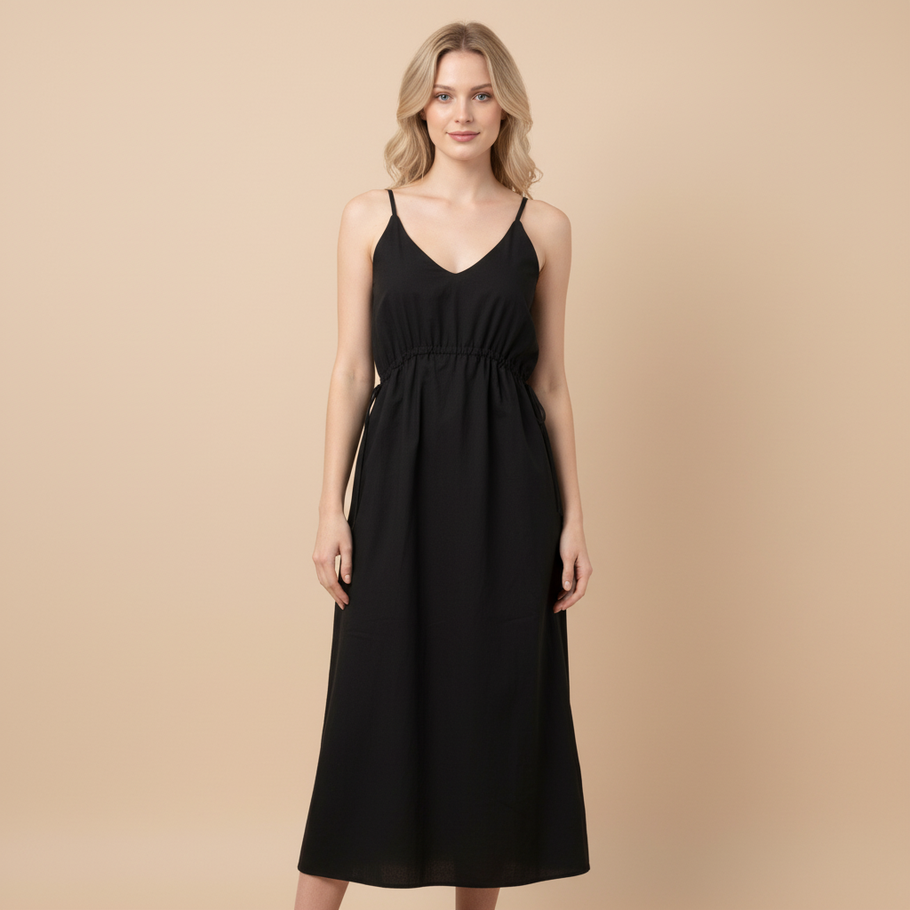 Vestido de tirantes de corte midi y escote acabado en pico. Presenta un corte justo debajo del pecho definido por una cintura elástica fruncida. En los costados de la cintura se aprecian pequeños lazos o cordones del mismo tejido que permiten un ajuste adicional. Forro interior. Textura suave y transpirable.