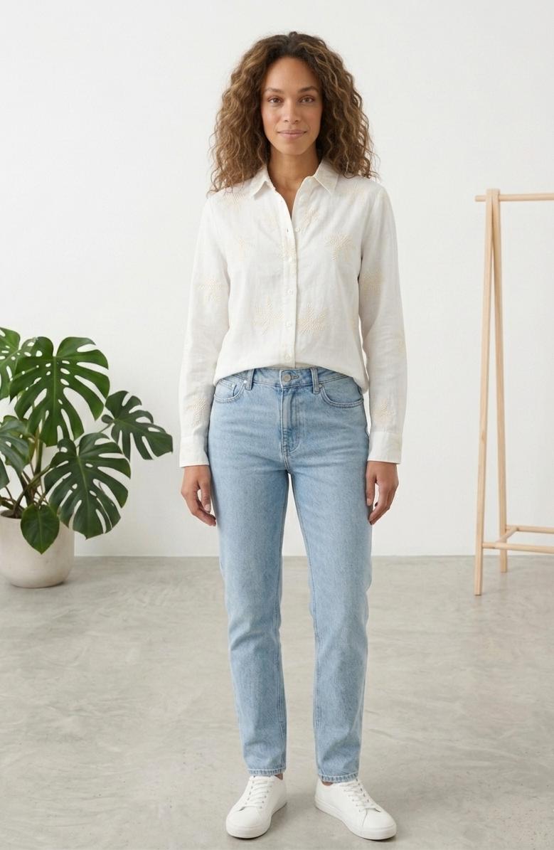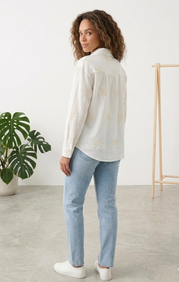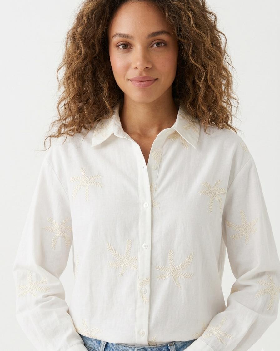 Camisa de manga larga y cuello camisero. Detalle de bordados de palmeras en tono beige en relieve. Cierre abotonado en la parte frontal y en puños. Diseño relajado.