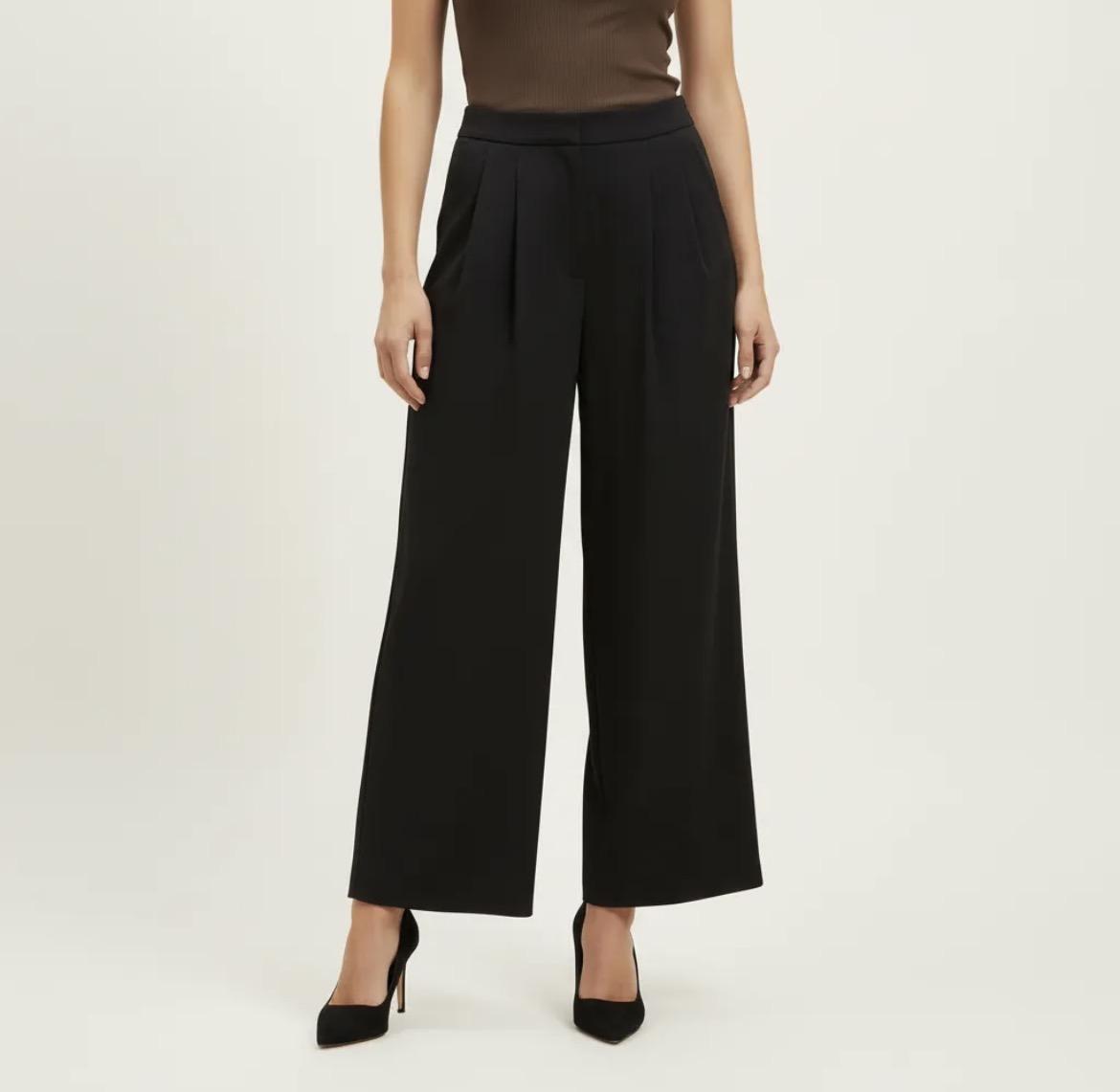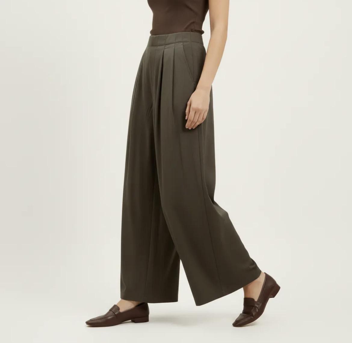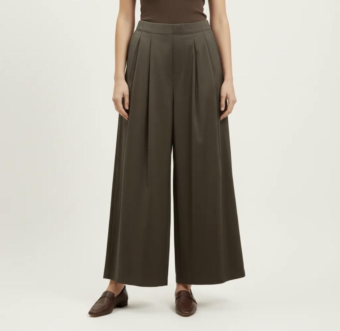 Pantalón de pinzas de pierna ancha. Tiene bolsillos y goma en cintura. Tejido fino y suave al tacto.