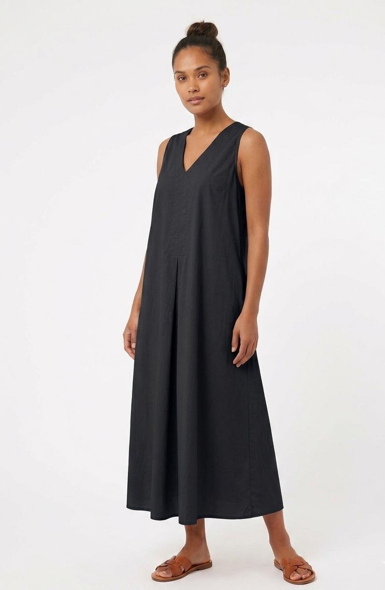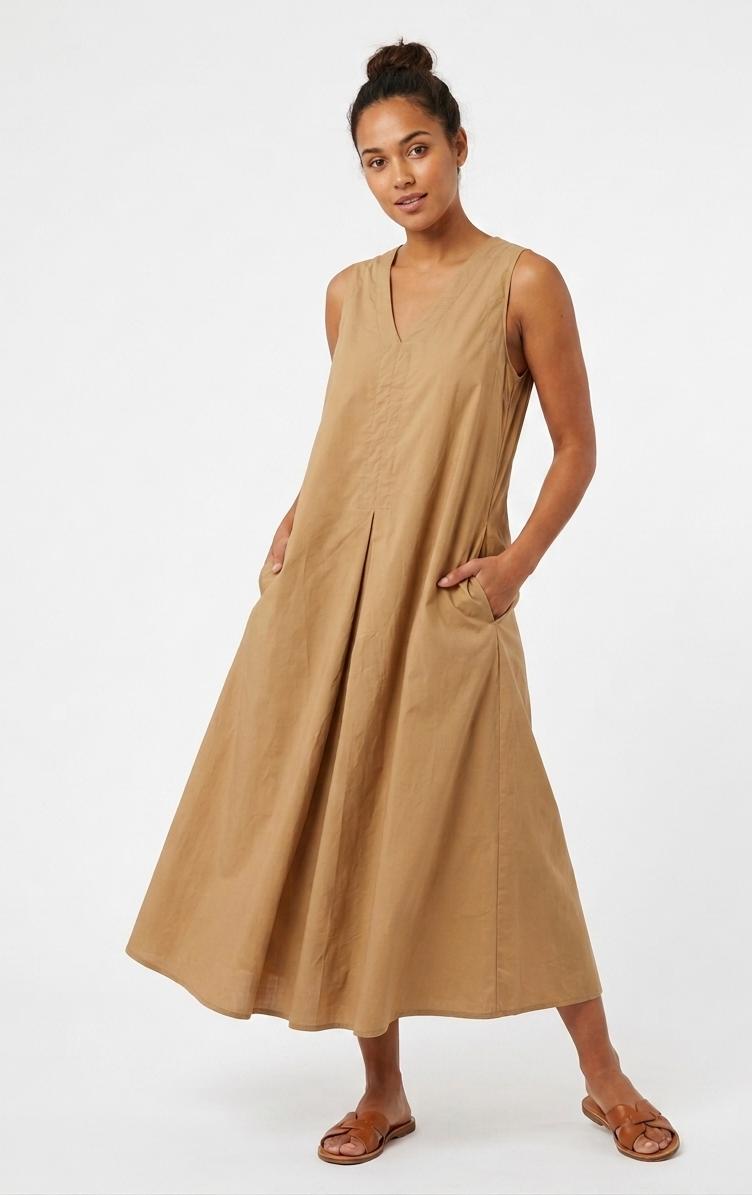 Vestido midi con corte evasé. Diseño sin mangas y escote acabado en pico. Posee una costura vertical que recorre todo el centro del vestido (delante y detrás), lo que ayuda a dar estructura a la prenda. En la parte delantera, bajo el pecho, nace un pliegue invertido que aporta un volumen extra. Incluye prácticos bolsillos laterales.