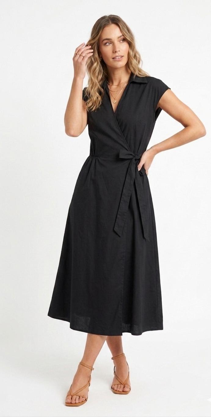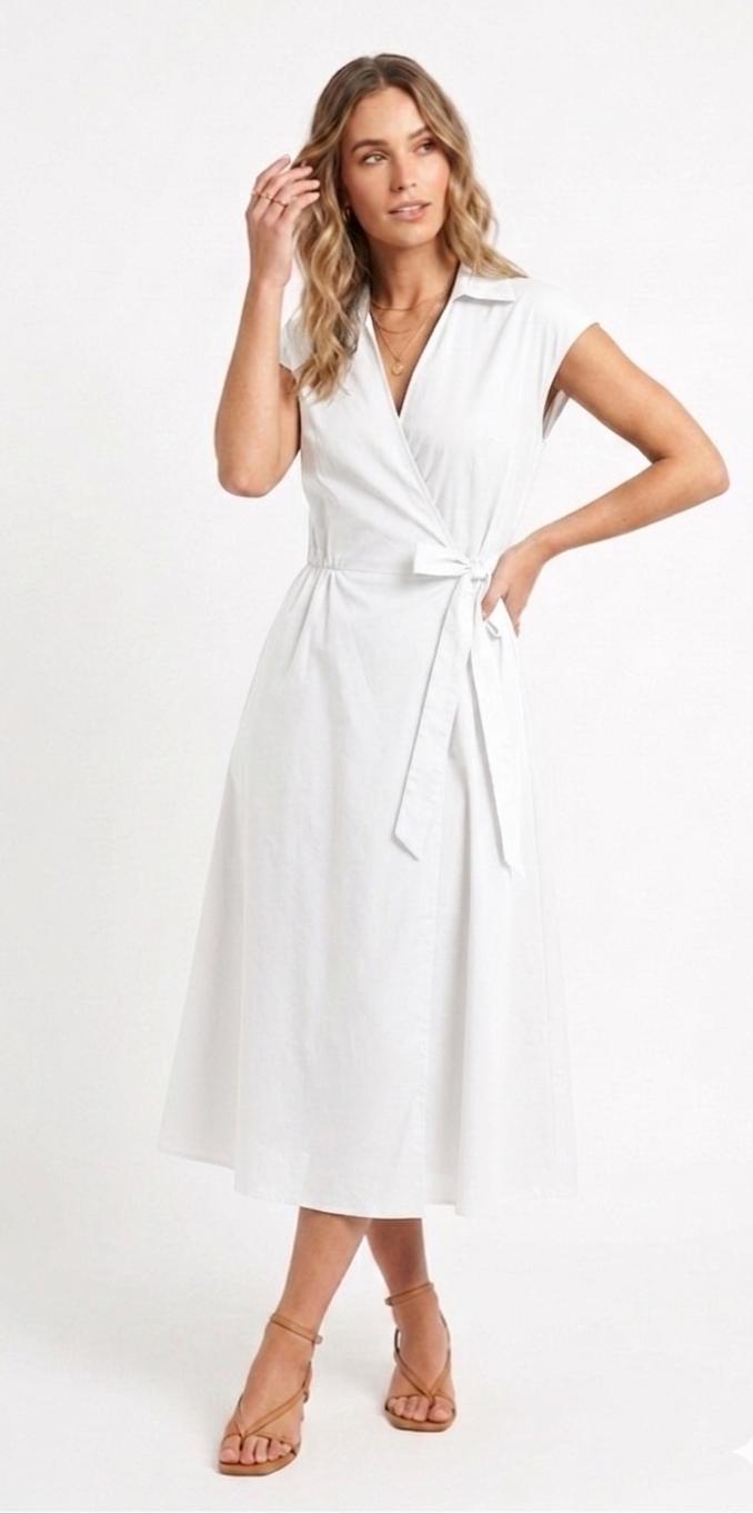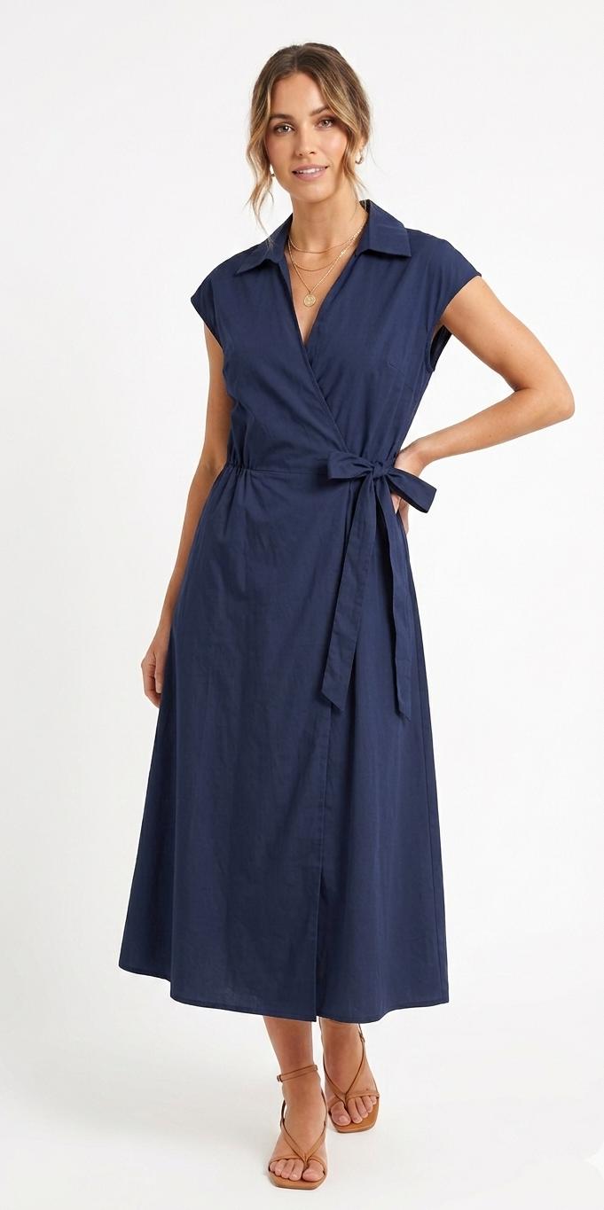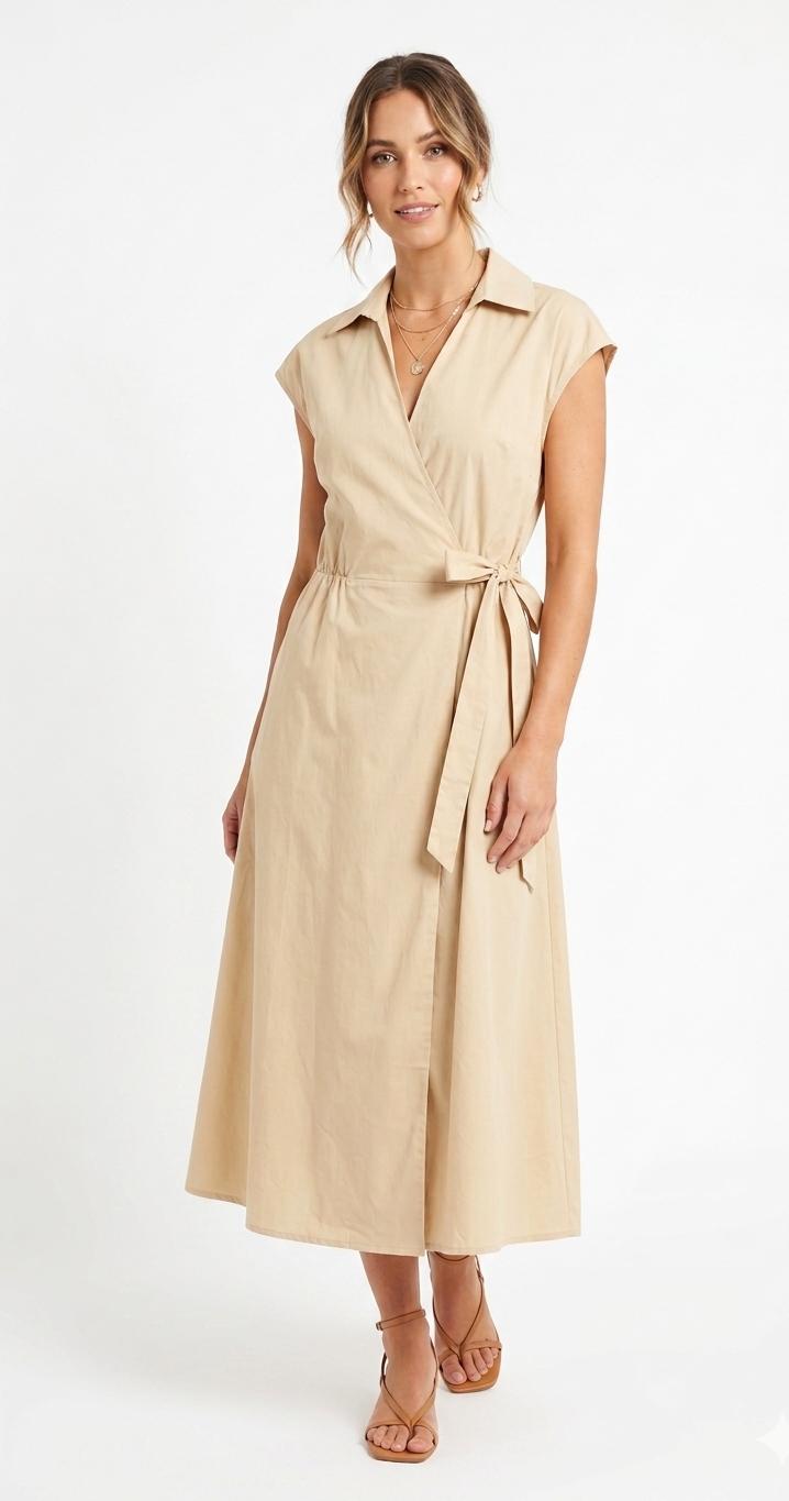 Vestido midi de manga corta y cuello camisero. Cuerpo cruzado en forma de "V" que estiliza el escote. El diseño se cierra o se ajusta mediante una lazada lateral en la cintura, lo que permite definir la figura de forma personalizada. Cintura elástica. Tejido fresco y ligero.
